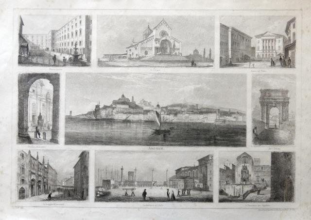 1860 circa. Incisione su acciaio, b/n, cm 18,5 x 26,9. Veduta panoramica di Ancona, attorniata da otto piccole vedute di scorci particolari della città, il tutto entro cornice. Ingiallimento all'angolo in basso a sinistra, nitida impressione, buono stato.