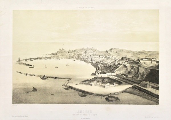 Litografia, mm 285x440. Non comune e fascinosa veduta a volo d'uccello della città marchigiana, tratta dal "L'Italie a Vol d'Oiseau", raccolta di vedute delle maggiori città italiane. La particolarità di queste vedute sta nel fatto che i disegni furono effettuati da Alfred Guesdon (1808-1876) a bordo di una mongolfiera. Buon esemplare con ampi margini. Timbrino a secco editoriale sotto al titolo. <BR>