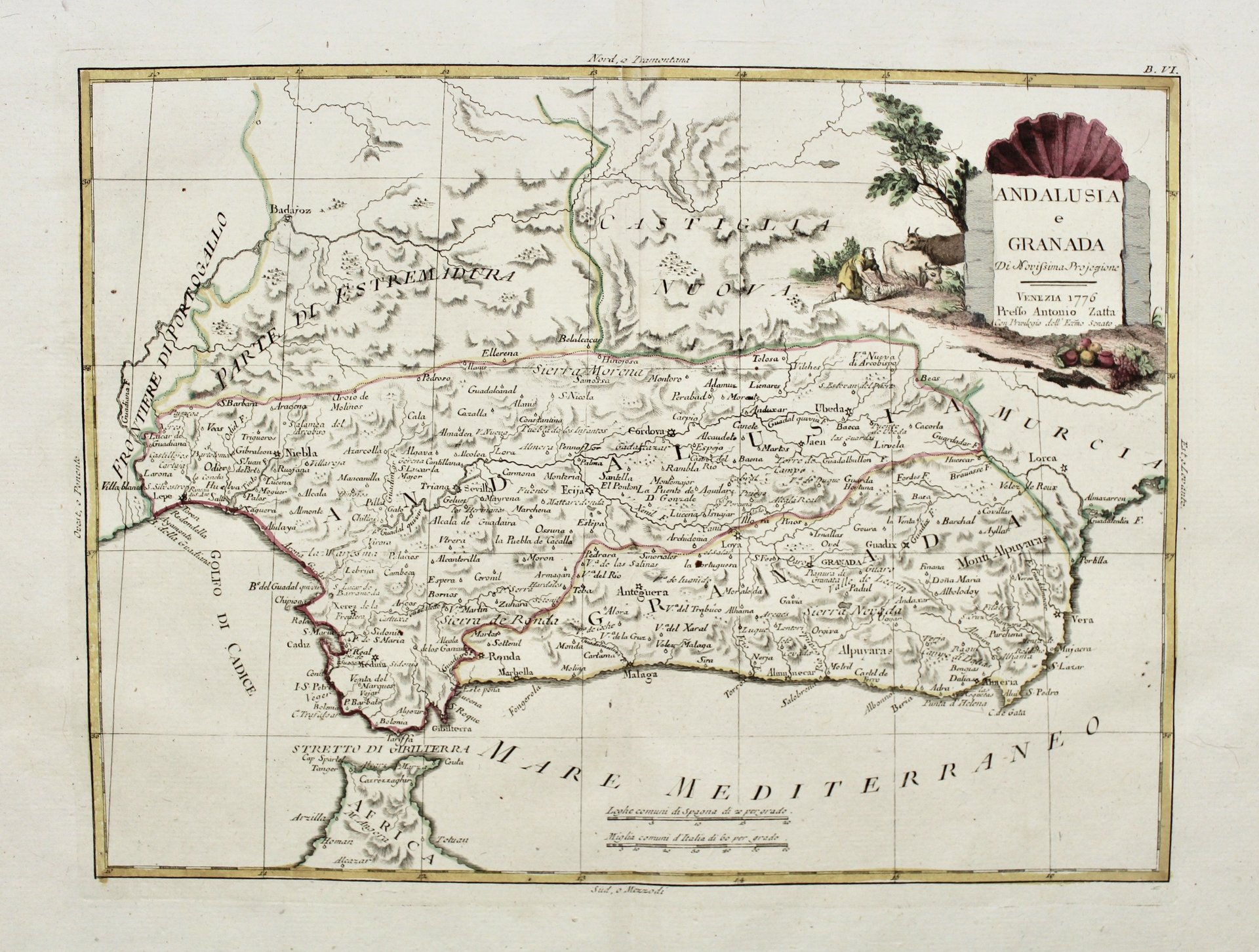Incisione in rame, mm 396x306; foglio mm 500x390; colorata d'epoca su carta vergellata con marca d'acqua. Antonio Zatta (1775-1797) fu uno dei più importanti editori di carte geografiche del tardo XVIII secolo italiano. La sua opera costituisce un importante punto di passaggio tra la cartografia antica e moderna, più attenta all'accuratezza dei dettagli geografici che all'abbellimento estetico ricco di motivi mitologici o d'invenzione, come era quello dell'epoca precedente. La sua opera più importante è Atlante novissimo pubblicato tra il 1775 e il 1789. I disegni delle illustrazioni furono curate da collaboratori quali Giovanni Marco Pitteri, Anton Friedrich Busching, Pietro Antonio Novelli, ed incise da Giuliano Zuliani. Ottimo esemplare a pieni margini. <BR>