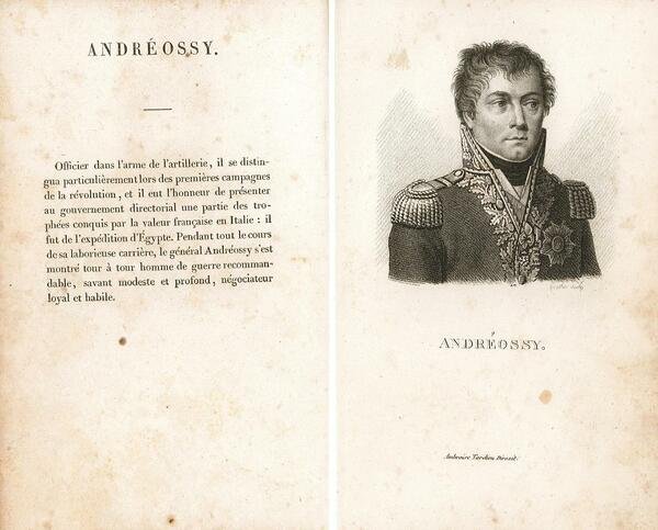 Ritratto del personaggio distintosi nelle vittorie e conquiste militari francesi tra il 1792 e 1815. L'incisione, antica ed originale, è accompagnata da pagina con testo descrittivo del personaggio. Foxing