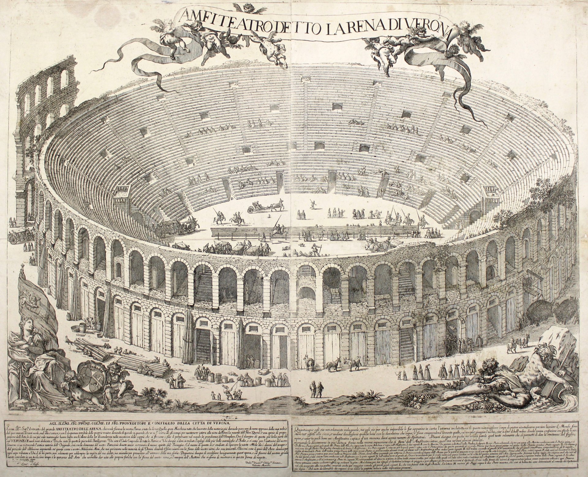 Acquaforte cm 73x89. <BR>L'animatissima visione dell'Arena, in due grandi rami su disegno di Louis Dorigny (1654 - 1742), apre uno squarcio di quotidianità sul monumento più noto di Verona. <BR>Siamo in Carnevale, la stampa porta la data 21 gennaio 1696. Lo confermano le maschere e il pulcinella-maccherone con la gobba a forma di corno, che gioca con i bambini in primo piano. Gli arcovoli, che tra la fine del Duecento e il primo Cinquecento avevano ospitato le prostitute, sono adesso usati come magazzini e botteghe: il laboratorio del bottaio, la rivendita di granaglie, l'osteria, la pesa dei carri di fieno. All'interno dell'anfiteatro si svolge un torneo cavalleresco destinato ai nobili, come sembra di poter dedurre dalle carrozze lasciate in sosta e da quelle in arrivo e per contrasto dei cappellacci e dai vestiti stracciati che distinguono il gruppo di popolani ripresi di spalla dalla gradinata più alta. Ma gustose scenette, che in qualche modo sembrano farsi gioco dell'ufficialità della lunga dedica ai provveditori di Comun, nella vignetta in basso richiamando la materialità del Carnevale, lo scherzo e la beffa, sono sparse ovunque. Le riassume l'accoppiamento di cani raffigurato proprio al centro della platea.<BR>L'Arena del Dorigny, che aggiorna la stampa cinquecentesca del Caroto, servita da modello fino ad allora, conosce una lunga fortuna iconografica. Tar gli altri viene ripresa da Giovanni Battista Piranesi e da Gaetano Testolini (1760 circa - 1818), che utilizza il punto di vista scelto dal Dorigny, trasformando per sintesi la veduta in una ricostruzione ideale completa di spaccato. <BR>Bell'esemplare stampato su carta forte in barbe, in bella impressione, condizioni generalmente ottime, la stampa presenta due antichi strappetti restaurati di cui uno in lastra in alto a destra accanto al cartiglio e uno fuori lastra al margine destro, due pallide macchie in alto a sinistra nel cielo. Molto rara. <BR>Girardi - Perini, Antiche stampe di Verona, pag. 30<BR>