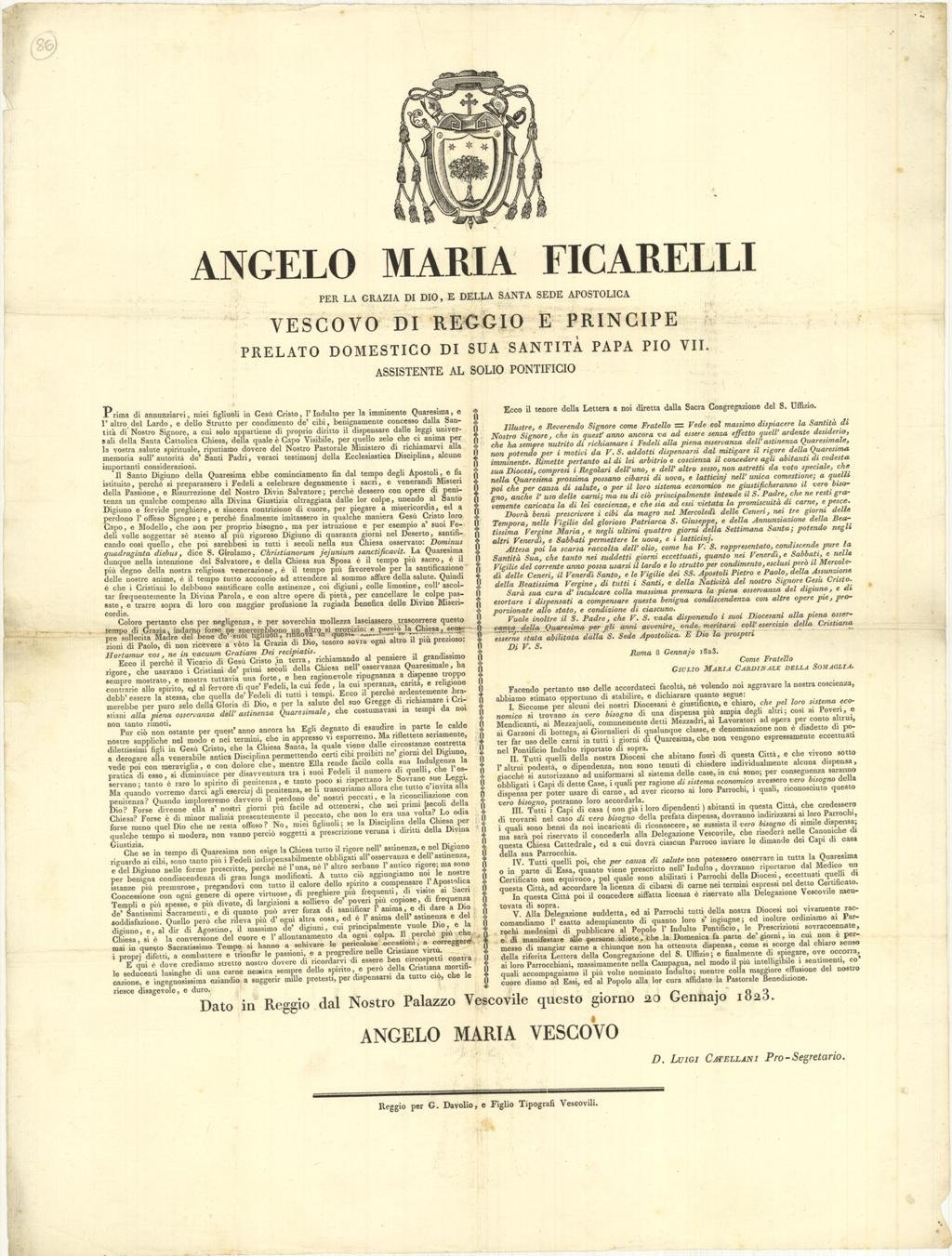 Angelo Maria Ficarelli per la grazia di Dio, e della Santa Sede Apostolica Vescovo di Reggio e Principe prelato domestico di sua Santità Papa Pio VII.
