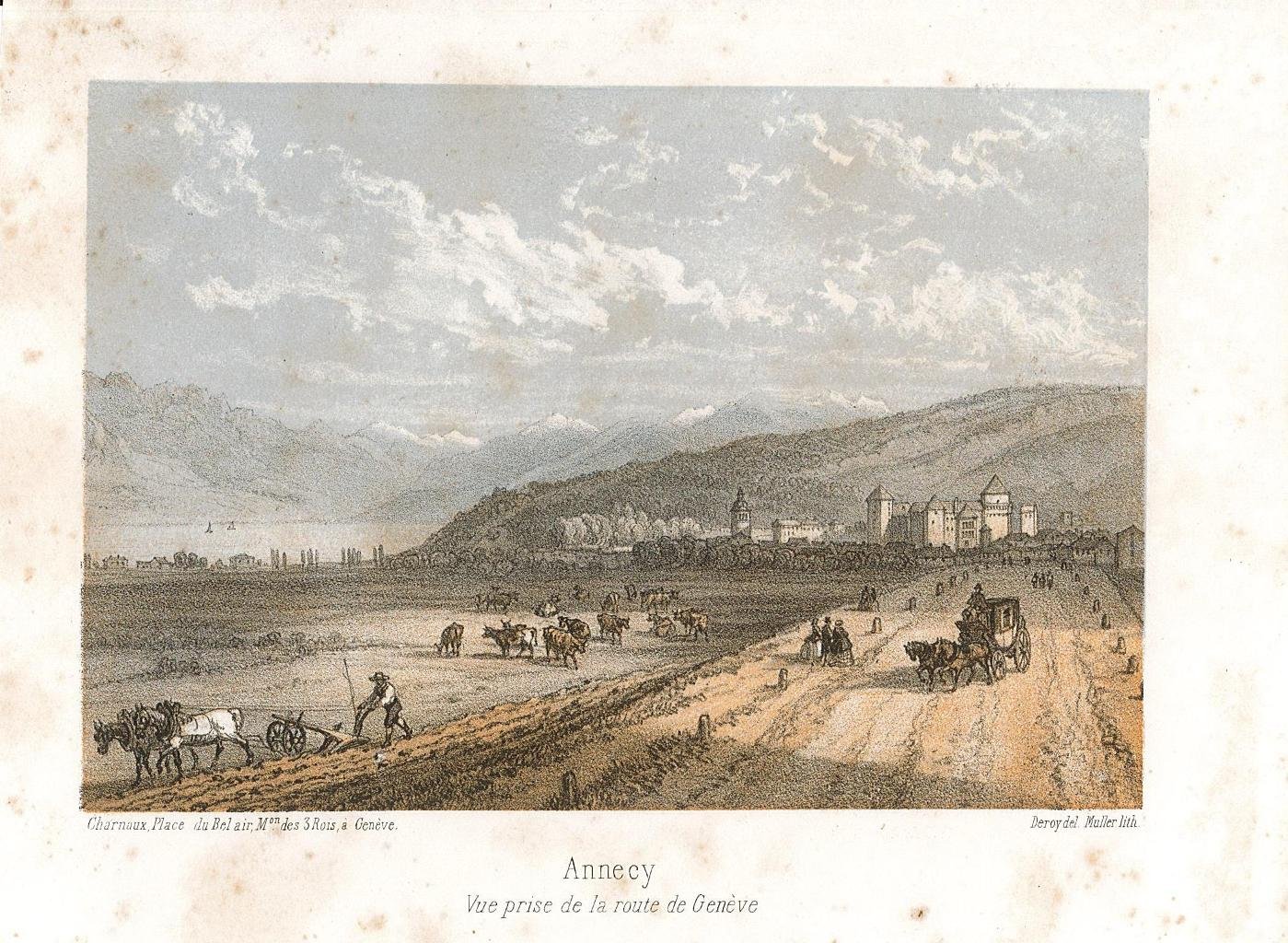 Veduta, antica ed originale, stampata a colori della cittadina di Annecy. Autore: Deroy del & Muller lith. Luogo: Annecy. Anno: 1860 ca. Tecnica: litografia. Dimensioni: 100x135. Leggero foxing