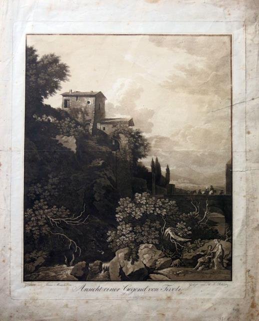Incisione in rame all’acquatinta virata al seppia, 1830 circa, cm 46,5 x 39,5 (alla lastra) più margini. Da un dipinto di Isaac Moucheron scorcio animato. Fioriture e alcune strappi ai margini (che talvolta toccano l'inciso) bella impressione.