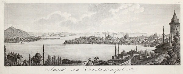 Incisione in rame di mm 154x434. Piacevole veduta del Corno d'Oro da nord. Ben conservata, con tracce di pieghe editoriali.<BR>Copper engraving, mm 154x434; long panoramic view of the old town from the opposite side of the Bosphorus and Galata tower. Very good condition. Original traces of editorial folds.