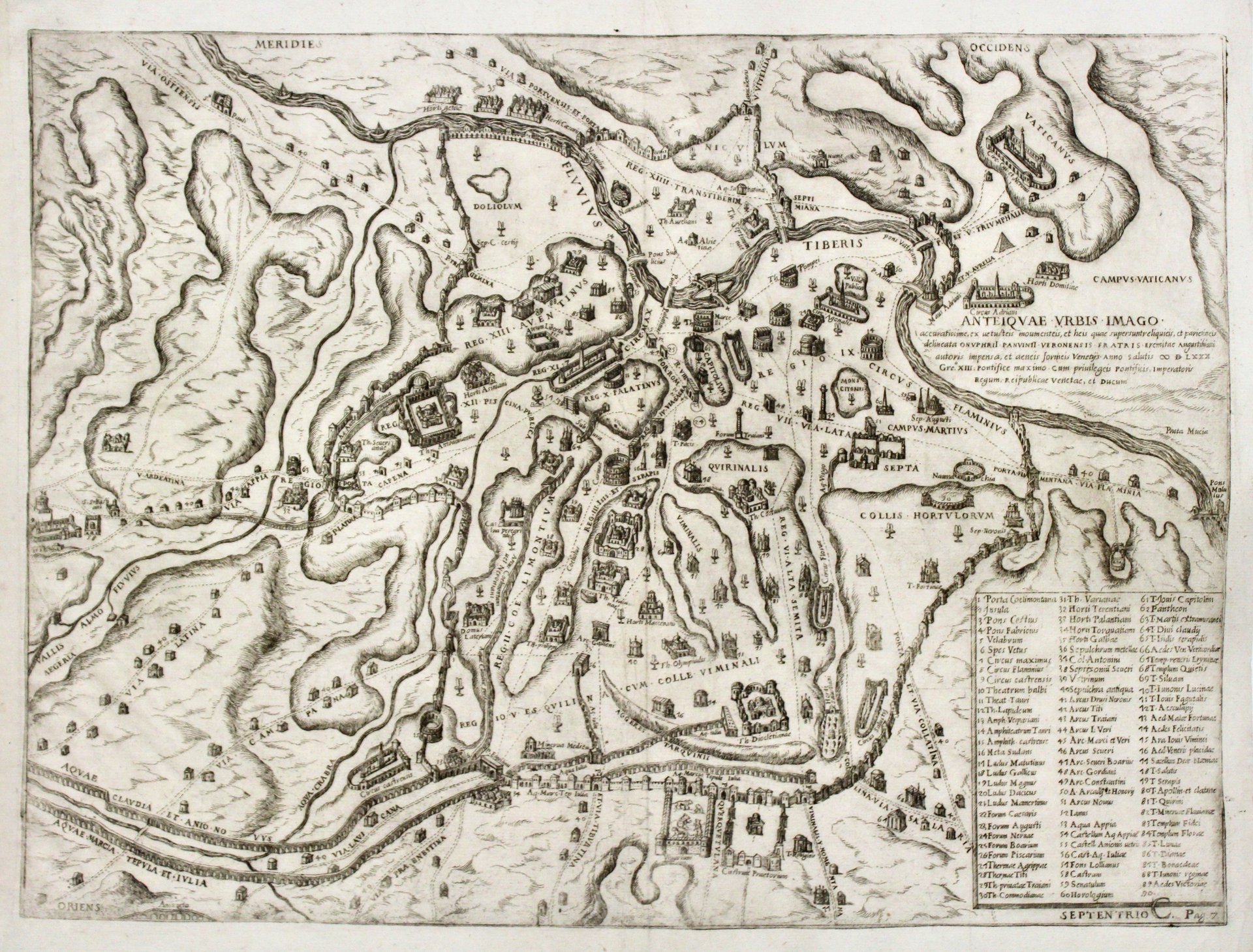 Acquaforte e bulino, dimensioni mm 330x442, impressa su carta vergata coeva, con margini, in perfetto stato di conservazione. Esemplare nel terzo stato di tre, stampato in "Venetijs Anno Salutis MDLXXX GRE XIII Pontifice maximo cum privilegeis Pontificis", e con, aggiunto in basso a destra: C, pag. 7. Tratto da "De ludis Circensibus", pubblicato da Giovan Battista Ciotti nel 1600<BR>Sul lato destro, sotto la ricostruzione del Circo Massimo, è inciso il titolo: ANTEIQUAE URBIS IMAGO accuratissime, ex vetusteis moumenteis, et heis quae supersunt reliquieis, et parichrieis delineata ONUPHRII PANVINII VERONENSIS FRATRIS Eremitae Augustiniani autoris impensa… Nel riquadro in basso a destra si trova una legenda numerica di 90 rimandi a luoghi e monumenti notabili (ma il n. 90 non riporta indicazioni), distribuita su tre colonne. Nella tavola presenti alcune indicazioni toponomastiche. Orientazione nei quattro angoli con il nome dei punti cardinali: SEPTENTRIO, MERIDIES, ORIENS, OCCIDENS, il nord-est è in basso. Pianta archeologica a proiezione verticale con elevazione dei soli monumenti antichi. Si tratta di una delle più importanti piante archeologiche della città, assieme a quella pubblicata nel libro di Bartolomeo Marliano "Urbis Romae Topographia B. Marliani" (1544) e alla piccola pianta archeologica del Ligorio (1553). Hülsen sostiene che l'orografia derivi dalla pianta moderna del Paciotto (1557) malgrado il Panvinio abbia rovesciato l'orientazione, portando il nord a destra. Sembra corretto sottolineare che l'opera abbia una derivazione comune dal Marliano e anche dal Bufalini (1551). La prima edizione, dedicata a papa Pio IV, fu stampata a Roma nel 1565 probabilmente dallo stesso Panvinio. Frutaz ricorda che il Panvinio si avvaleva della collaborazione del pittore parmigiano Mercurio Baiardi e ipotizza che questi possa essere l'autore della pianta. L'opera è molto rara ed è inserita nell'esemplare di Monaco di Baviera dello Speculum Romanae Magnificentiae di Antonio Lafreri, come pure nel secondo volume della raccolta cartografica fattizia cinquecentesca della Biblioteca Nazionale di Firenze. La lastra fu ristampata, a Venezia, con la data aggiornata al 1580 e dedicata a papa Gregorio XIII. Una terza stesura della lastra, con il numero di pagina aggiunto, è inserita nel libro postumo del Panvinio, il De ludis Circensibus stampato a Venezia nel 1600 da G. Battista Ciotti e successivamente a Padova nel 1642 da Paolo Frambotti. Erudito. Agostiniano, si dette in Roma, giovanissimo, a indagini sull'antichità romana, acquistando grande fama. Pio IV lo nominò revisore alla Biblioteca Vaticana. Fra le molte sue opere, specialmente notevoli i Commentarii ai Fasti (1558), i Commentarii ai Trionfi, i Comizi imperiali, le Antichità veronesi (incompiute), una silloge di epigrafi, ecc. Le sue schede manoscritte, preziose fonti sui monumenti medievali romani e notevoli testimonianze sul suo metodo critico, si conservano nella Bibl. Vaticana. Fu ritratto da Tiziano (Roma, gall. Colonna). Nel 1556 realizzò lagrande carta archeologica di Roma antica. In quello stesso periodo ha iniziato a collaborare con l'incisore francese Étienne Dupérac, che ha continuato a fornire illustrazioni per stampe postume delle opere del Panvinio.<BR>Borroni Salvadori (1980): n. 212; Caldana (2013): n. I.13; Frutaz (1962): n. XX e tav. 35; Hülsen (1915): IX, p. 57, nn. 47-48; Scaccia Scarafoni (1939): nn. 14-15. Bifolco-Ronca, Cartografia e Topografia Italiana del XVI secolo, Catalogo ragionato delle opera a stampa (2018), pp. 2350-2351, tav. 1209, terzo stato di tre. <BR>