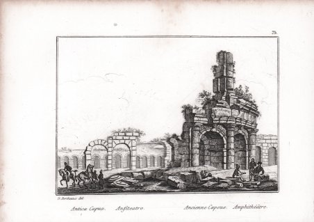 Veduta tratta dal celebre ' L'Italie, la Sicile, les Iles Éoliennes, l'Ile d'Elbe, la Sardaigne, Malte, l'Ile de Calypso etc. D'après les inspirations, les recherches et les travaux de M. M. le Vicomte de Chateaubriand, De Lamartine, Raoul-Rochette, le Comte de Forbin, Piranesi, Mazzara, et de Napoléon, Denon, Saint-Non, Lord Byron, Goethe, Visconti, Cicognara, Lanzi, de Bonstetten, Swinburne, etc. Sites, Monumens, Scènes et Costumes, d'après M.me Haudebourt-Lescot, MM. Horace-Vernet, Granet, Isabey, Ciceri, Mazzara, le Major Light, le Cap. Batty, Cooke, Gell et Gandy, Pinelli, Ferrari, Zucoli, et beaucoup d'autres artistes italiens. Recueillis et publiés par Audot Père, Membre de la Société de Géographie, ' edito a Parigi tra il 1834 ed il 1837 e ristampato a Torino [Giuseppe Pomba e Ca, 1834-1838]. L'opera, in cinque volumi, raccoglie scritti di autori vari, curati da Audot, ed è riccamente illustrata da 324 incisioni su acciaio fuori testo, molte delle quali con accostamento multiplo, per un totale di 473 tavole. Fu notoriamente mastodontico il lavoro cui si sottopose Louis Eustache Audot (1783-1870). View taken from the famous ' L'Italie, la Sicile, les Iles Éoliennes, l'Ile d'Elbe, la Sardaigne, Malte, l'Ile de Calypso etc. D'après les inspirations, les recherches et les travaux de M. M. le Vicomte de Chateaubriand, De Lamartine, Raoul-Rochette, le Comte de Forbin, Piranesi, Mazzara, et de Napoléon, Denon, Saint-Non, Lord Byron, Goethe, Visconti, Cicognara, Lanzi, de Bonstetten, Swinburne, etc. Sites, Monumens, Scènes et Costumes, d'après M.me Haudebourt-Lescot, MM. Horace-Vernet, Granet, Isabey, Ciceri, Mazzara, le Major Light, le Capt. Batty, Cooke, Gell et Gandy, Pinelli, Ferrari, Zucoli, et beaucoup d'autres artistes italiens. Recueillis et publiés par Audot Père, Membre de la Société de Géographie, ' published in Paris between 1834 and 1837 and reprinted in Turin [Giuseppe Pomba e Ca, 1834-1838]. The work, in five volumes, collects the writings of various authors, edited by Audot, and is richly illustrated with 324 engravings on steel outside the text, many of them with multiple combinations, for a total of 473 tables. Louis Eustache Audot (1783-1870) was a notoriously mammoth task. Cfr.