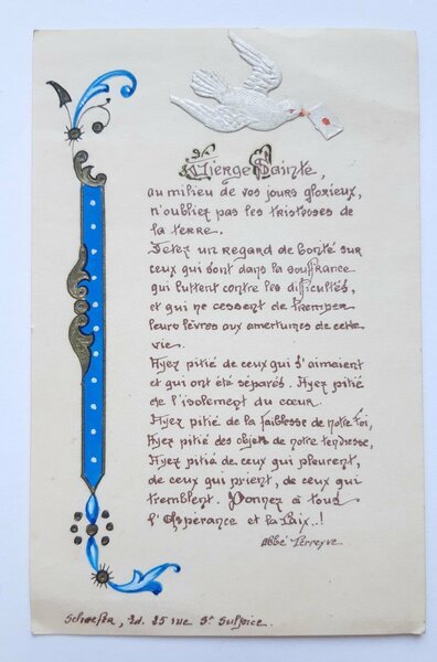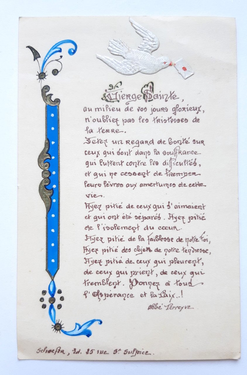 Antico biglietto manufatto preghiera con applicazione al margine superiore, disegno e preghiera a mano, in buone condizioni una lieve piega al margine superiore cm. 12,5 x 8