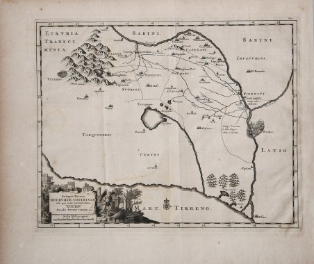 Carta geografica della Tuscia meridionale, tratta dal “Thesaurus Antiquitatum et Historiarum Italiae, Neapolis, Siciliae Sardiniaae, Corsicae e Melitae”, monumentale opera di Georgius Graevius pubblicata nel primo quarto del XVIII secolo. Deriva dalla carta contenuta in L’antico Veio di Famiano Nardino. Discorso investigativo del Sito di quella Città, stampato da Vitale Mascardi, in Roma, 1647. Tra il 1704 e il 1725 sono stampati a Leida i 45 volumi del "Thesaurus antiquitatum", generazione complessa, laboriosa, esaltata da alcuni come straordinaria, criticata, invece, da altri, che ne parlarono come di una "compilation énorme sans choix e sans ordre ". Un progetto che ha riguardato molto i contemporanei, in Italia, ma che ha interessato poco storiografia dopo che, tranne rari casi, ne ha sottolineato il carattere meramente erudito e la sostanziale inutilità. L'opera di Graevius è tuttavia arricchita dalle preziose tavole firmate dall'editore olandese Pieter Vander AA. Incisione in rame, leggere bruniture, in ottimo stato di conservazione. Carta geografica della Tuscia meridionale, tratta dal “Thesaurus Antiquitatum et Historiarum Italiae, Neapolis, Siciliae Sardiniaae, Corsicae e Melitae”, monumentale opera di Georgius Graevius pubblicata nel primo quarto del XVIII secolo. Tra il 1704 e il 1725 sono stampati a Leida i 45 volumi del "Thesaurus antiquitatum", generazione complessa, laboriosa, esaltata da alcuni come straordinaria, criticata, invece, da altri, che ne parlarono come di una "compilation énorme sans choix e sans ordre ". Un progetto che ha riguardato molto i contemporanei, in Italia, ma che ha interessato poco storiografia dopo che, tranne rari casi, ne ha sottolineato il carattere meramente erudito e la sostanziale inutilità. L'opera di Graevius è tuttavia arricchita dalle preziose tavole firmate dall'editore olandese Pieter Vander AA. Incisione in rame, leggere bruniture, in ottimo stato di conservazione. Cfr.
