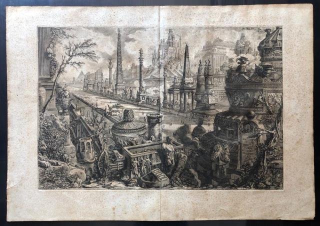 Tratta da “Le Antichità romane”, probabile II tiratura. Roma, 1784 circa. Tavola II - tomo III che contiene gli “Avanzi de' monumenti sepolcrali di Roma e dell'agro romano”. Incisione in rame all’acquaforte e bulino, b/n, cm 40 x 60 circa (alla battuta) e 52 x 74,5 circa (al foglio); in lastra, alto a destra, “II Tom. III”; in lastra, in basso a sinistra, “Gio. Battista Piranesi inv. dis. e incise”; consueta piega centrale verticale. Esemplare senza filigrana del giglio in doppio cerchio. L' incisione ritrae l’Antico Circo Marziale con la vista adiacente della Via Appia Antica. L'architettura classica è maestosamente grandiosa e solenne: il principale pensiero espresso nelle “Antichità Romane” consisteva infatti nel documentare un patrimonio monumentale che andava di giorno in giorno sgretolandosi. Henry Focillon, nel suo saggio del 1918, suppone che Piranesi prepari e incida le tavole tra il 1750 e il 1756. Tuttavia ci sono alcuni elementi che ne farebbero risalire alcune addirittura al 1746 e forse ad anni ancora più precedenti, considerata l’estrema complessità dell’opera, legata ad un lunghissimo lavoro di ricerca e preparazione, e confrontate le stesse tavole che sembrano evidenziare elementi stilistici differenti riscontrabili comparando le varie tavole. Minuto ma diffuso foxing ai margini, peraltro bella prova con un ottimo inciso ben impresso e chiaroscurato.