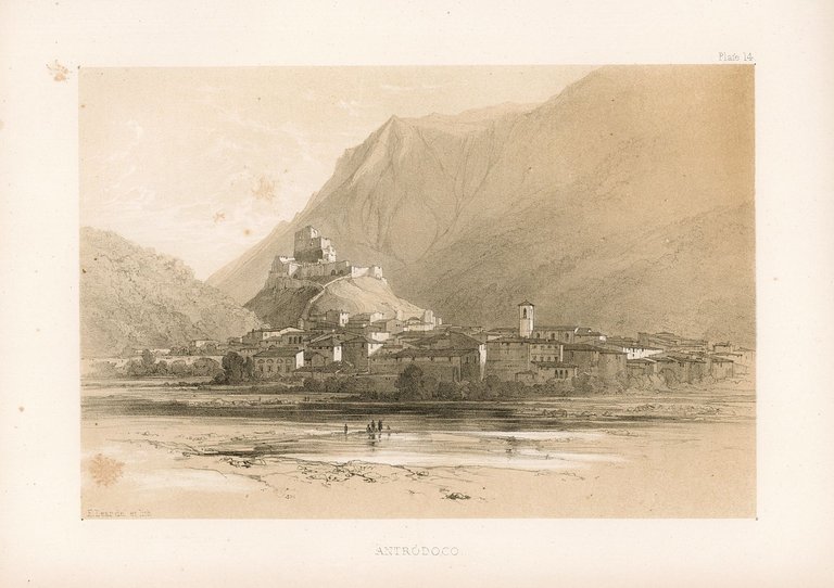 Bella e rara veduta della cittadina di Antrodoco in provincia di Rieti, stampata su fondino seppia. Inserita nel secondo volume dell’opera “Illustrated excursions in Italy by Edward Lear” London: Thomas M’Lean, 26, Haymarket M.DCCC.XLVI.