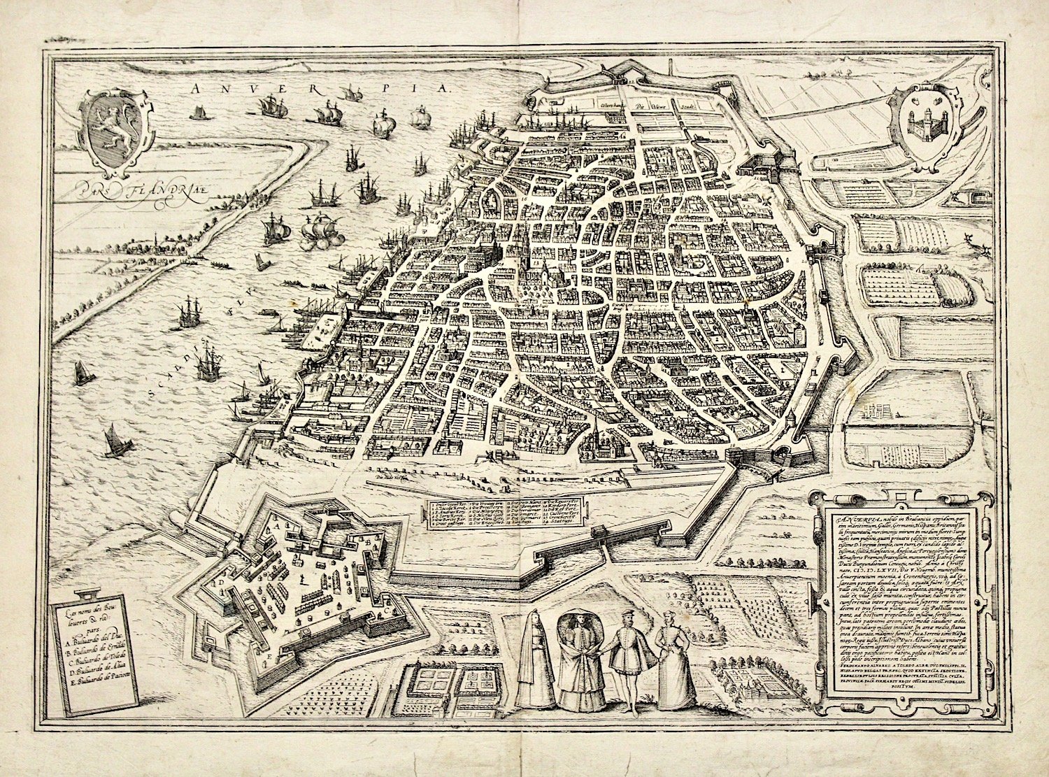Incisione in rame, mm 340x478. Fascinosa veduta panoramica della capitale belga colta dal mare a volo d'uccello nella parte superiore e laterale sinistra.Tratta da "Civitates Orbis Terrarum", pietra miliare del vedutismo, stampata dal 1572 al 1617 in 6 volumi pubblicati in anni differenti in varie lingue, compilata e scritta da Georg Braun, mentre Frans Hogenberg fu autore delle incisioni insieme a Simon Novellanus, generalmente da soggetti di Georg Hoefnagel. Buonesemplare con fascetta di rinforzo al verso del marg. inferiore con minimi strappetti restaurati.