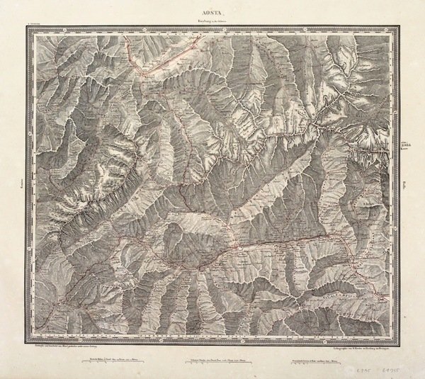 Litografia eseguita da B. Herder, mm 384x450. Sezione di una grande carta, raffigurante tutta la Val d’Aosta. Le vie di comunicazione sono segnate in rosso. Non comune.