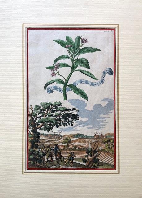 Tratta dall'opera di Johann Christoph Volkamer “Hesperides” (“Esperidi”) pubblicata a Norimberga intorno al 1710. Incisione in rame all'acquaforte, in recente ma in bella e vivace coloritura, cm 20,5 x 31 (alla lastra) più margini. Ottimo stato di conservazione. L'opera, in due volumi, consiste in una raccolta di tavole che raffigurano prevalentemente agrumi: limoni, lime, arance, bergamotti, pompelmi, ananas, melograni, ma anche noci di cocco, nelle loro varietà e forme, sia tipiche che esotiche, fluttuano come corpi celesti sopra le ville italiane, le campagne e i giardini, dando vita a un'opera originale e di gran fascino. L' apparato iconografico è di ricercata bellezza: le incisioni raffigurano frutti nella parte superiore; palazzi, ville, giardini e labirinti nella parte inferiore, con architetture che sono per lo più quelle del nord est d'Italia, ossia della provincia di Padova e di Verona. Johann Christoph Volkamer (1644 - 1720) figlio di un medico e botanico dedito alla progettazione di giardini, fu un intraprendente commerciante di Norimberga che ereditò dal padre la profonda passione per la botanica. Intorno al 1660 visitò numerosi parchi e giardini d' Italia, da cui nacque il suo particolare interesse per l’universo degli agrumi. Rientrato in Germania costruì il proprio giardino, dove instaurò numerose piante e da cui trasse ispirazione per realizzare i suoi numerosi schizzi, che sarebbero poi andati a comporre, fra il 1708 e il 1710, la sua opera più importante, il “Nürbergisches Hesperides oder gründliche Beschreibung der edlen Citronat, Citronen - und Pomeranzen – Früchte.”. In questa splendida raccolta (di evidente derivazione dalle “Hesperides, sive, De malorum aureorum cultura”, di Giovanni Battista Ferrari, opera che appunto celebrava gli agrumi) il Volckamer riuscì a coniugare suggestioni storiche e letterarie con una puntuale ricerca scientifica, intrecciando mirabilmente i frutti della natura a splendidi paesaggi e architetture. (Cfr. Blunt: “Delightful views of the gardens and palaces of Germany, Austria and Italy”). .