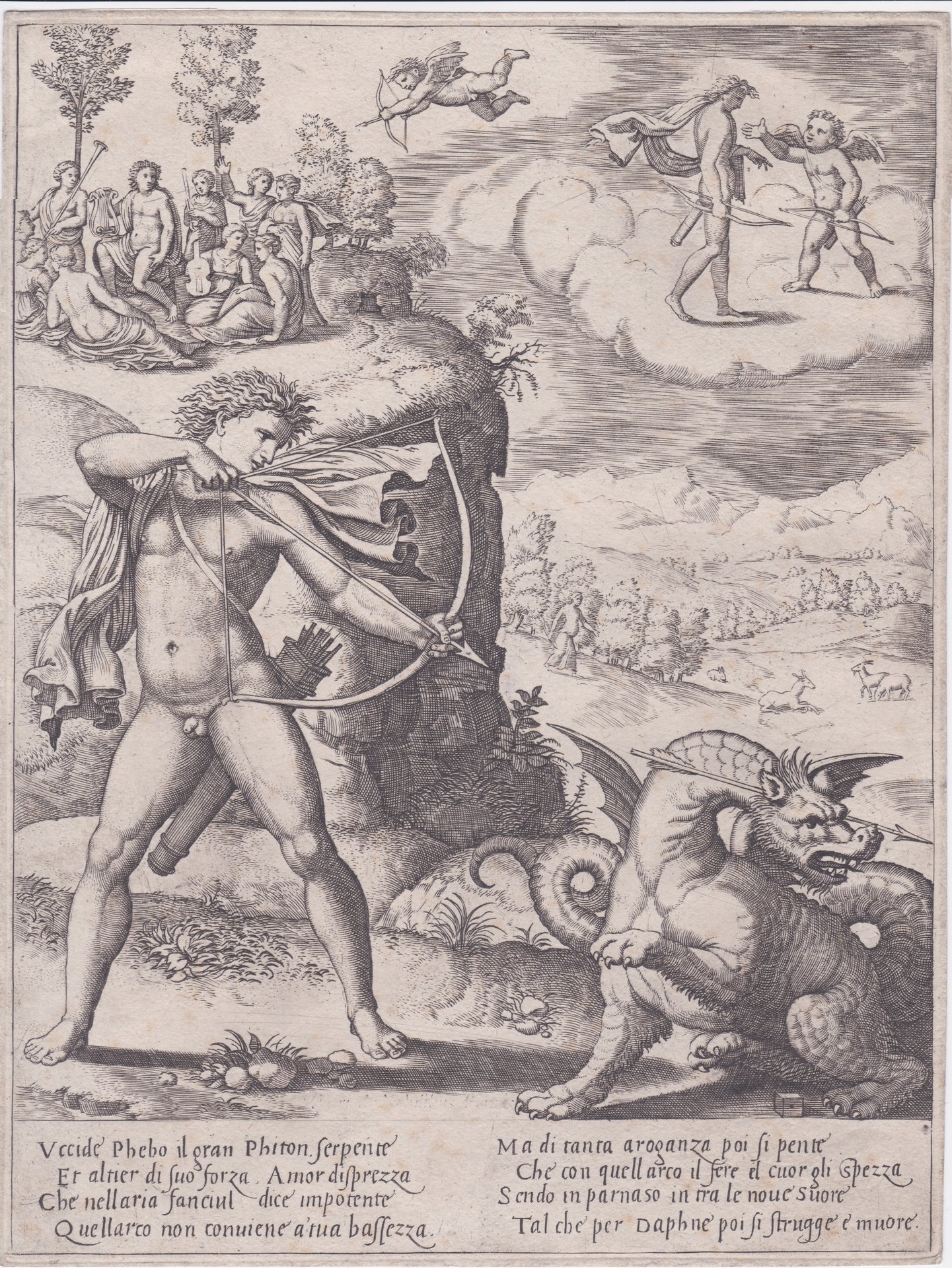 Dalla serie di quattro soggetti tratti dalle Metamorfosi di Ovidio dal titolo: La storia di Apollo e Daphne, da Giulio Romano secondo Bartsh o da Baldassare Tommaso Peruzzi (Ancaiano 1481 – 1536 Rome). Nella composizione tre episodi: in primo piano l'uccisione del mostruoso Pitone sorto dalle acque del diluvio universale voluto da Giove; su una nuvola a destra Apollo che deride Cupido considerandolo inadatto all'uso dell'arco, a sinistra Apollo tra le ninfe colpito dalla freccia di Cupido, sullo sfondo Dafne resa ostile all'amore da Cupido. In basso sotto il soggetto otto righe di testo su due colonne spiegano la scena. Esemplare nel II/II stato con i ritocchi eseguiti da Philippe Thomassin (Troyes 1562- Rome in 1622) nella zona inferiore della faretra che ora risulta completamente scura. Al verso timbro di Albert van Loock (Rouen 1917-2011 ?) Libraio, editore e commerciante d'arte di Bruxelles, il timbro appare su stampe e disegni che ha venduto (L.3751). Altri esemplari sono al MET e al V&A