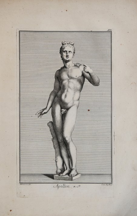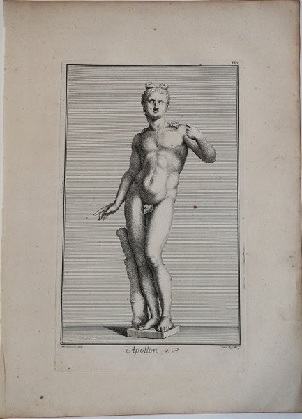 Opera tratta da Recueil des marbres antiques qui se trouvent dans la Galerie du Roy de Pologne à Dresden avec privilege du roy, l'année 1733, pubblicata da Raymond Leplat a Dresda nel 1735. Il catalogo raccoglie, in 230 tavole, la Galleria scultorea, antica e moderna, e altri oggetti artistici posseduti dall’elettore di Sassonia, Federico Augusto I detto Augusto il Forte, morto proprio nel 1733. Il re aveva acquistato arte antica da Federico Guglielmo I di Prussia (compresa la collezione dei ritratti romani di Bellori) e dalle famiglie Chigi e Albani di Roma (sculture, vasi, bronzi e mummie). Sebbene il frontespizio rechi la data del 1733, le tavole recano date anche successive. (1734-1735). Manca un apparato di commento che indichi le provenienze dei pezzi e la maggior parte delle tavole recano solo una breve denominazione dei soggetti, prevalentemente mitologici, raffigurati. Quasi tutte le tavole sono firmate dagli disegnatori e dagli incisori. I disegnatori sono A.M. Wernerin, J. Preissler, M. Tuscher e H. Preissler. Gli incisori L. Zucchi, C.F. Boetius, G. Mart. Preissler, Johann Balthasar Probst, Bernigeroth, Johann David Hertz, Iac. Gottlieb Thelot, Iac. Andr. Fridrich, Christian Philipp Lindemann, Hieronymus Sperling, “MB”, Joh. Jac. Steltzer o Chr. Raym. Thoman. Acquaforte, in ottimo stato di conservazione. Plate from Recueil des marbres antiques qui se trouvent dans la Galerie du Roy de Pologne à Dresden […], published in Dresden by Raymond Le Plat, in 1735. The collection of ancient and modern art at Dresden had been established by Friedrich August I (“Augustus the Strong”), who died in the same year as this book was published. He had bought antiquities from Frederick William I of Prussia (including the Bellori collection of Roman portraits) and from the Chigi and Albani families of Rome (including sculpture, vases, bronzes and mummies). Several Roman antiquities had arrived in Dresden as recently as 1729. The plates have no accompanying explanatory texts, but most are captioned. Subjects are chiefly mythological (the collection includes copies of some famous works, such as Praxiteles's “Satyr” and Scopas's “Maenad tearing a goat”). Almost all the plates are signed by draughtsmen and engravers. The draughtsmen were A.M. Wernerin, Joh. Justin Preissler, M. Tuscher or H. Preissler. The engravers were Lorenzo Zucchi, C.F. Boetius, Georg Mart. Preissler, Johann Balthasar Probst, Bernigeroth, Johann David Hertz, Iac. Gottlieb Thelot, Iac. Andr. Fridrich, Christian Philipp Lindemann, Hieronymus Sperling, “MB”, Joh. Jac. Steltzer or Chr. Raym. Thoman. Etching, in very good condition. Cfr.