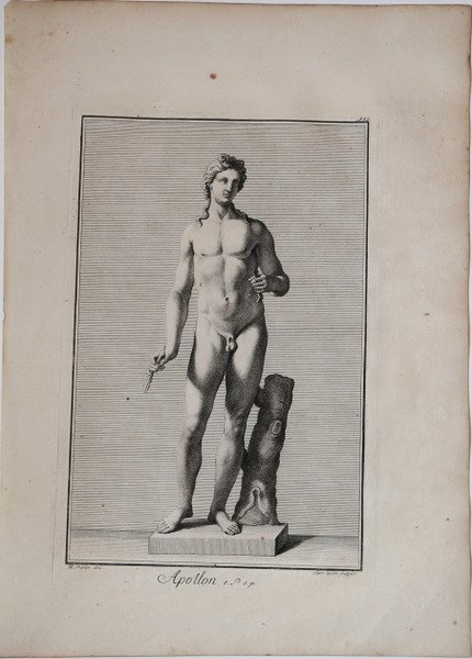 Opera tratta da Recueil des marbres antiques qui se trouvent dans la Galerie du Roy de Pologne à Dresden avec privilege du roy, l'année 1733, pubblicata da Raymond Leplat a Dresda nel 1735. Il catalogo raccoglie, in 230 tavole, la Galleria scultorea, antica e moderna, e altri oggetti artistici posseduti dall’elettore di Sassonia, Federico Augusto I detto Augusto il Forte, morto proprio nel 1733. Il re aveva acquistato arte antica da Federico Guglielmo I di Prussia (compresa la collezione dei ritratti romani di Bellori) e dalle famiglie Chigi e Albani di Roma (sculture, vasi, bronzi e mummie). Sebbene il frontespizio rechi la data del 1733, le tavole recano date anche successive. (1734-1735). Manca un apparato di commento che indichi le provenienze dei pezzi e la maggior parte delle tavole recano solo una breve denominazione dei soggetti, prevalentemente mitologici, raffigurati. Quasi tutte le tavole sono firmate dagli disegnatori e dagli incisori. I disegnatori sono A.M. Wernerin, J. Preissler, M. Tuscher e H. Preissler. Gli incisori L. Zucchi, C.F. Boetius, G. Mart. Preissler, Johann Balthasar Probst, Bernigeroth, Johann David Hertz, Iac. Gottlieb Thelot, Iac. Andr. Fridrich, Christian Philipp Lindemann, Hieronymus Sperling, “MB”, Joh. Jac. Steltzer o Chr. Raym. Thoman. Acquaforte, in ottimo stato di conservazione. Plate from Recueil des marbres antiques qui se trouvent dans la Galerie du Roy de Pologne à Dresden […], published in Dresden by Raymond Le Plat, in 1735. The collection of ancient and modern art at Dresden had been established by Friedrich August I (“Augustus the Strong”), who died in the same year as this book was published. He had bought antiquities from Frederick William I of Prussia (including the Bellori collection of Roman portraits) and from the Chigi and Albani families of Rome (including sculpture, vases, bronzes and mummies). Several Roman antiquities had arrived in Dresden as recently as 1729. The plates have no accompanying explanatory texts, but most are captioned. Subjects are chiefly mythological (the collection includes copies of some famous works, such as Praxiteles's “Satyr” and Scopas's “Maenad tearing a goat”). Almost all the plates are signed by draughtsmen and engravers. The draughtsmen were A.M. Wernerin, Joh. Justin Preissler, M. Tuscher or H. Preissler. The engravers were Lorenzo Zucchi, C.F. Boetius, Georg Mart. Preissler, Johann Balthasar Probst, Bernigeroth, Johann David Hertz, Iac. Gottlieb Thelot, Iac. Andr. Fridrich, Christian Philipp Lindemann, Hieronymus Sperling, “MB”, Joh. Jac. Steltzer or Chr. Raym. Thoman. Etching, in very good condition. Cfr.