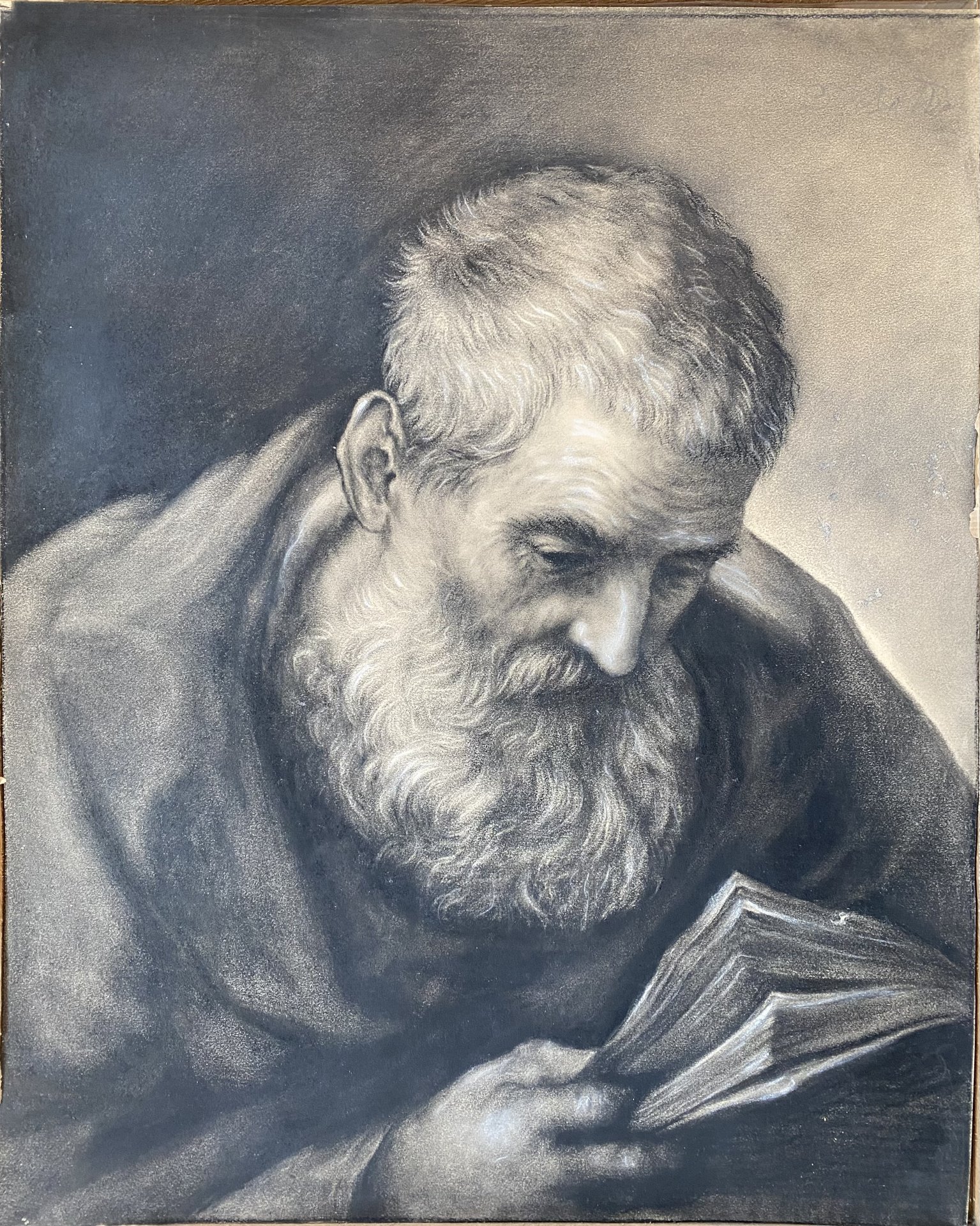 Il disegno traduce, secondo le foto conservate nell'archivio Federico Zeri, la tela di Guido Reni della Pinacoteca di Brera. Il dipinto è stato interpretato sia come San Giuseppe, sia più genericamente come un Apostolo. Secondo Pepper il dipinto è da ascrivere alla bottega di Reni. In relazione con la serie dei quattro evangelisti del 1601 oggi in South Carolina, Bob Jones University, sarebbe una variante del San Pietro. Il dipinto è presente a Brera dal 1855 proveniente dalla collezione di Pietro Oggiono. Motta potrebbe dunque aver eseguito il disegno durante una visita alla Pinacoteca. Firma a matita D Motta, in alto a destra. Pur trattandosi di una copia dall'antico Motta da prova di grande capacità tecnica, riuscendo a tradurre la lucente profondità della materia pittorica. L'opera è conservata in cornice dorata d'epoca.