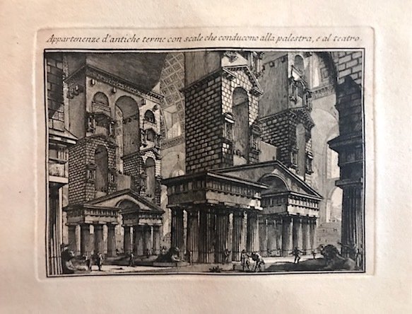 Incisione originale su rame (cm. 21,5x16 più ampi margini bianchi) tratta dalla rara opera ‘Opere varie di Architettura, Prospettive, Grotteschi, Antichità sul gusto degli antichi Romani.’. Magnifica prova impressa su carta vergellata. Esemplare in eccellente stato di conservazione. Focillon, n. 126; Wilton-Ely, n. 47; Ficacci, n. 406. Questa incisione, alla pari di ogni altra frutto del lavoro giovanile presente nelle ‘Opere varie’, ben evidenzia in maniera particolare le doti di inventiva e di fantasia che avrebbero caratterizzato tutta la produzione artistica di Piranesi.
