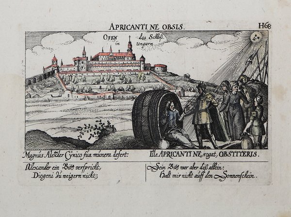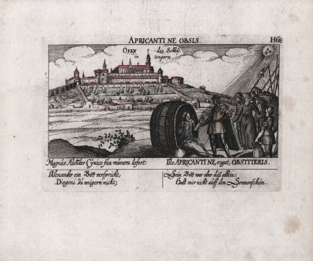 Veduta tratta dall'edizione del 1678 della celebre ' Sciagraphia Cosmica ' nota anche con il titolo ' Das ist Newes Emblematisches Buechlei, dainen in acht Centurijs die vornembste Stat, Vestung, Schlosser der ganzen Welt. ' stampata a Norinberga. La ' Sciagraphia Cosmica, venne ampliata sotto la supervisione di Kieser dopo la morte di Meisner nel 1625, arrivando quindi ad una composizione di 800 magnifiche incisioni. ' Ogni opera è caratterizzata da un motto sopra l'immagine, e da versi emblematici (in latino o tedesco). L'opera è la combinazione di due generi allora popolari, il libro degli stemmi e il "Teatro delle città". Tra i maestri incisori e miniatori che contribuirono a questa serie ci sono Matthäus Merian, Sebastian Furck, Christian Stimmer e forse anche Meisner stesso, che concepì l'opera e contribuì a buona parte della prosa. ' Incisione in rame, con margini, in perfetto stato di conservazione. View taken from the 1678 edition of the famous ' Sciagraphia Cosmica ' also known with the full title ' Sciagraphia Cosmica: ' Das ist Newes Emblematisches Buechlei, dainen in acht Centurijs die vornembste Stat, Vestung, Schlosser der ganzen Welt. printed in Nuremberg. The ' Sciagraphia Cosmica, was expanded under the supervision of Kieser after the death of Meisner in 1625, thus arriving at a composition of 800 magnificent engravings. ' Each engraving is characterized by a motto above the image, and by emblematic verses (in Latin or German). The work is a combination of two then-popular genres, the book of coats of arms and the "Town Book". Among the master engravers and illuminators who contributed to this series are Matthäus Merian, Sebastian Furck, Christian Stimmer, and perhaps Meisner himself, who conceived the work and contributed much of the prose. ' Copperplate engraving, with margins, in perfect condition. Cfr.