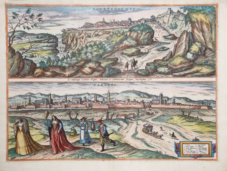 Foglio contenente le vedute prospettiche di Acquapendente e Treviso. L’opera è inserita nel ' Civitates Orbis Terrarum, il primo atlante devoto esclusivamente alle piante e vedute delle principali città del mondo. ' La veduta di Acquapendente di G. Hoefnagel, ripresa sa un soggetto Ludovico Toeput detto il Pozzoserrato. ' La veduta da ovest evidenzia la posizione della città su una terrazza rocciosa a strapiombo. A sinistra della città si trova la cattedrale di San Sepolcro e al centro la chiesa di San Francesco, il cui importante campanile risale al Rinascimento. In cima alla collina, all'estrema destra, si trova il Monastero di Santa Chiara, costruito nel 1333 su un sito precedentemente occupato da una fortezza imperiale. La veduta della città fortificata di Treviso è presa da Sud. Così Georg Braun descrive la città: “Treviso è una nobile città della Marca Trevigiana, molto famosa nella storia dei Goti, poiché il padre del re Totila, che regnò a Verona e a Treviso, si dilettava particolarmente in questa città e vi abitava lui stesso, e suo figlio Totila, che poi divenne re degli Ostrogoti, vi nacque e fu educato. La città di Treviso ha tutte le necessità della vita in abbondanza, poiché è molto ben fornita di grano, vino, altri frutti e bestiame. Nella città sul fiume Sile ci sono molte fontane e magnifici edifici e case”. Il primo volume delle ' Civitates Orbis Terrarum ' fu pubblicato a Colonia nel 1572. Il sesto e ultimo volume apparve nel 1617. Questo grande atlante di città – cartografia urbana - curato da Georg Braun e inciso in gran parte da Franz Hogenberg, conteneva 546 prospettive, vedute a volo d'uccello e vedute cartografiche di città di tutto il mondo. Franz Hogenberg realizzò le tavole dei primi quattro volumi e Simon van den Neuwel (Novellanus, attivo dal 1580) quelle dei volumi V e VI. Georg Braun (1541-1622), un ecclesiastico di Colonia, fu il principale redattore dell'opera e fu molto aiutato nel suo progetto dalla vicinanza e dal continuo interesse di Abraham Ortelius, il cui ' Theatrum Orbis Terrarum ' del 1570 fu, come raccolta sistematica e completa di mappe di stile uniforme, il primo vero atlante. Le ' Civitates, ' in effetti, erano destinate ad accompagnare il ' Theatrum, ' come indicato dalla somiglianza dei titoli e dai riferimenti contemporanei sulla natura complementare delle due opere. Tuttavia, le ' Civitates ' erano progettate per avere un approccio più popolare, senza dubbio perché la novità di una raccolta di piante e vedute di città rappresentava un'impresa commerciale più rischiosa di un atlante mondiale, per il quale c'erano stati diversi precedenti di successo. Franz Hogenberg (1535-1590) era figlio di un incisore di Monaco che si era stabilito a Malines. Incise la maggior parte delle tavole del ' Theatrum ' di Ortelius e la maggior parte di quelle delle ' Civitates, e potrebbe essere anche indicato come il responsabile dell'origine del progetto. Oltre un centinaio di artisti e cartografi diversi, il più importante dei quali fu l'artista di Anversa Georg Hoefnagel (1542-1600), fornirono i disegni per le tavole delle ' Civitates. Hoefnagel non solo contribuì alla maggior parte del materiale originale per le città spagnole e italiane, ma rielaborò e modificò anche quello di altri collaboratori. Dopo la morte di Hoefnagel, il figlio Jakob continuò il lavoro per le ' Civitates. Gli autori della raccolta si proponevano di raffigurare "non icones et typi urbium", cioè non immagini generiche e tipizzate, "sed urbes ipsae admirabili caelaturae artificio, spectantium oculis subiectae appareant": non intendeva alludere o idealizzare, ma rappresentare fedelmente sulla carta, riprodurre esattamente, e in tempo reale, ciò che l'occhio vede, come annunciato nella prefazione al primo volume delle ' Civitates Orbis Terrarum. Incisione in rame, finemente colorata a mano, in ottimo stato di conservazione. Sheet containing perspective views of Acquapendente and Treviso. The work is included in Civitates Orbis Terrarum, the first atlas devoted exclusively to plans and views of the world's major cities. View of Acquapendente by G. Hoefnagel after Ludovico Toeput. ' The view from the west highlights the town's dramatic location on a precipitous rock terrace. On the left of the town lies the cathedral of San Sepolcro and in the centre the church of San Francesco, whose prominent bell tower dates from the Renaissance. On top of the hill on the far right lies the Monastero di Santa Chiara, built in 1333 on a site formerly occupied by an imperial fortress. Acquapendente, which in 1499 became part of the Papal States, lies north of the Lake Bolsena on the road that leads from Siena to Rome via Viterbo. The fortified city of Treviso is seen from the south, in its picturesque setting on the banks of the Sile River with the Alps (11) in the background. The tallest tower in the city is the Torre del Comune (6) on the Piazza dei Signori, which is surrounded by palaces with open arcades. Further left is the cathedral of San Pietro (1). Further left again is the Dominican church of San Nicolò. Commentary by Braun: “Treviso is a noble town in the March of Treviso and very famous in the history of the Goths, since the father of King Totila, who ruled in Verona and Treviso, took particular delight in this town and lived there himself, and his son Totila, who later became king of the Ostrogoths, was born and educated there. The city of Treviso has all the necessities of life in abundance, for it is very well supplied with grain, wine, other fruits and cattle. In the city on the River Sile there are very many drinking fountains and magnificent buildings and houses.” The work is included in the ' Civitates Orbis Terrarum, the first atlas devoted exclusively to plans and views of the world's major cities. Printed in six volumes between 1572 and 1617 it was so successful and widespread that several editions translated into Latin, German and Fr