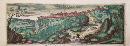Veduta di Acquapendente di G. Hoefnagel, ripresa sa un soggetto Ludovico Toeput detto il Pozzoserrato. ' La veduta da ovest evidenzia la posizione della città su una terrazza rocciosa a strapiombo. A sinistra della città si trova la cattedrale di San Sepolcro e al centro la chiesa di San Francesco, il cui importante campanile risale al Rinascimento. In cima alla collina, all'estrema destra, si trova il Monastero di Santa Chiara, costruito nel 1333 su un sito precedentemente occupato da una fortezza imperiale. ' L’opera è inserita nel ' Civitates Orbis Terrarum, il primo atlante devoto esclusivamente alle piante e vedute delle principali città del mondo. ' Il primo volume delle ' Civitates Orbis Terrarum ' fu pubblicato a Colonia nel 1572. Il sesto e ultimo volume apparve nel 1617. Questo grande atlante di città – cartografia urbana - curato da Georg Braun e inciso in gran parte da Franz Hogenberg, conteneva 546 prospettive, vedute a volo d'uccello e vedute cartografiche di città di tutto il mondo. Franz Hogenberg realizzò le tavole dei primi quattro volumi e Simon van den Neuwel (Novellanus, attivo dal 1580) quelle dei volumi V e VI. Georg Braun (1541-1622), un ecclesiastico di Colonia, fu il principale redattore dell'opera e fu molto aiutato nel suo progetto dalla vicinanza e dal continuo interesse di Abraham Ortelius, il cui ' Theatrum Orbis Terrarum ' del 1570 fu, come raccolta sistematica e completa di mappe di stile uniforme, il primo vero atlante. Le ' Civitates, ' in effetti, erano destinate ad accompagnare il ' Theatrum, ' come indicato dalla somiglianza dei titoli e dai riferimenti contemporanei sulla natura complementare delle due opere. Tuttavia, le ' Civitates ' erano progettate per avere un approccio più popolare, senza dubbio perché la novità di una raccolta di piante e vedute di città rappresentava un'impresa commerciale più rischiosa di un atlante mondiale, per il quale c'erano stati diversi precedenti di successo. Franz Hogenberg (1535-1590) era figlio di un incisore di Monaco che si era stabilito a Malines. Incise la maggior parte delle tavole del ' Theatrum ' di Ortelius e la maggior parte di quelle delle ' Civitates, e potrebbe essere anche indicato come il responsabile dell'origine del progetto. Oltre un centinaio di artisti e cartografi diversi, il più importante dei quali fu l'artista di Anversa Georg Hoefnagel (1542-1600), fornirono i disegni per le tavole delle ' Civitates. Hoefnagel non solo contribuì alla maggior parte del materiale originale per le città spagnole e italiane, ma rielaborò e modificò anche quello di altri collaboratori. Dopo la morte di Hoefnagel, il figlio Jakob continuò il lavoro per le ' Civitates. Gli autori della raccolta si proponevano di raffigurare "non icones et typi urbium", cioè non immagini generiche e tipizzate, "sed urbes ipsae admirabili caelaturae artificio, spectantium oculis subiectae appareant": non intendeva alludere o idealizzare, ma rappresentare fedelmente sulla carta, riprodurre esattamente, e in tempo reale, ciò che l'occhio vede, come annunciato nella prefazione al primo volume delle ' Civitates Orbis Terrarum. Incisione in rame, bella coloritura coeva, in ottimo stato di conservazione. View of Acquapendente by G. Hoefnagel after Ludovico Toeput. ' The view from the west highlights the town's dramatic location on a precipitous rock terrace. On the left of the town lies the cathedral of San Sepolcro and in the centre the church of San Francesco, whose prominent bell tower dates from the Renaissance. On top of the hill on the far right lies the Monastero di Santa Chiara, built in 1333 on a site formerly occupied by an imperial fortress. Acquapendente, which in 1499 became part of the Papal States, lies north of the Lake Bolsena on the road that leads from Siena to Rome via Viterbo. The work is included in the ' Civitates Orbis Terrarum, the first atlas devoted exclusively to plans and views of the world's major cities. Printed in six volumes between 1572 and 1617 it was so successful and widespread that several editions translated into Latin, German and French were printed. The first volume of the ' Civitates Orbis Terrarum ' was published in Cologne in 1572. The sixth and the final volume appeared in 1617. This great city atlas, edited by Georg Braun and largely engraved by Franz Hogenberg, eventually contained 546 prospects, bird-eye views and map views of cities from all over the world. Fransz Hogenberg produced the plates for the first four books, and Simon van den Neuwel (Novellanus, active since 1580) those for volumes V and VI. Georg Braun (1541-1622), a cleric of Cologne, was the principal editor of the work, and was greatly assisted in his project by the close, and continued interest of Abraham Ortelius, whose ' Theatrum Orbis Terrarum ' of 1570 was, as a systematic and comprehensive collection of maps of uniform style, the first true atlas. The ' Civitates, ' indeed, was intended as a companion for the ' Theatrum, ' as indicated by the similarity in the titles and by contemporary references regarding the complementary nature of two works. Nevertheless, the ' Civitates ' was designs to be more popular in approach, no doubt because the novelty of a collection of city plans and views represented a more hazardous commercial undertaking than a world atlas, for which there had been a number of successful precedents. Franz Hogenberg (1535-1590) was the son of a Munich engraves who settled in Malines. He engraved most of the plates for Ortelius's ' Theatrum ' and the majority of those in the ' Civitates, and may have been responsible for originating the project. Over a hundred of different artists and cartographers, the most significant of whom was Antwerp artist Georg Hoefnagel (1542-1600), engraved the cooper-plates of the ' Civitates ' from drawings. He not only contributed most of the original material for the Spanish and Italian towns but also reworked and modified those of other contributor