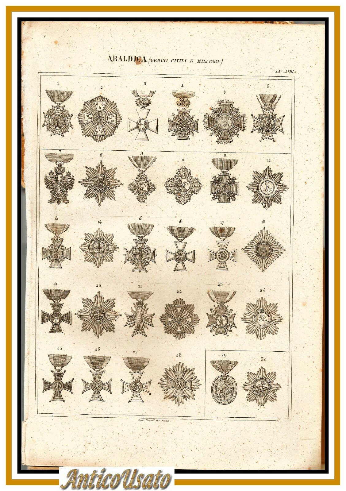 ARALDICA MEDAGLIE ORDINI CIVILI E MILITARI 1866 Tavola XVIII Antica Incisione