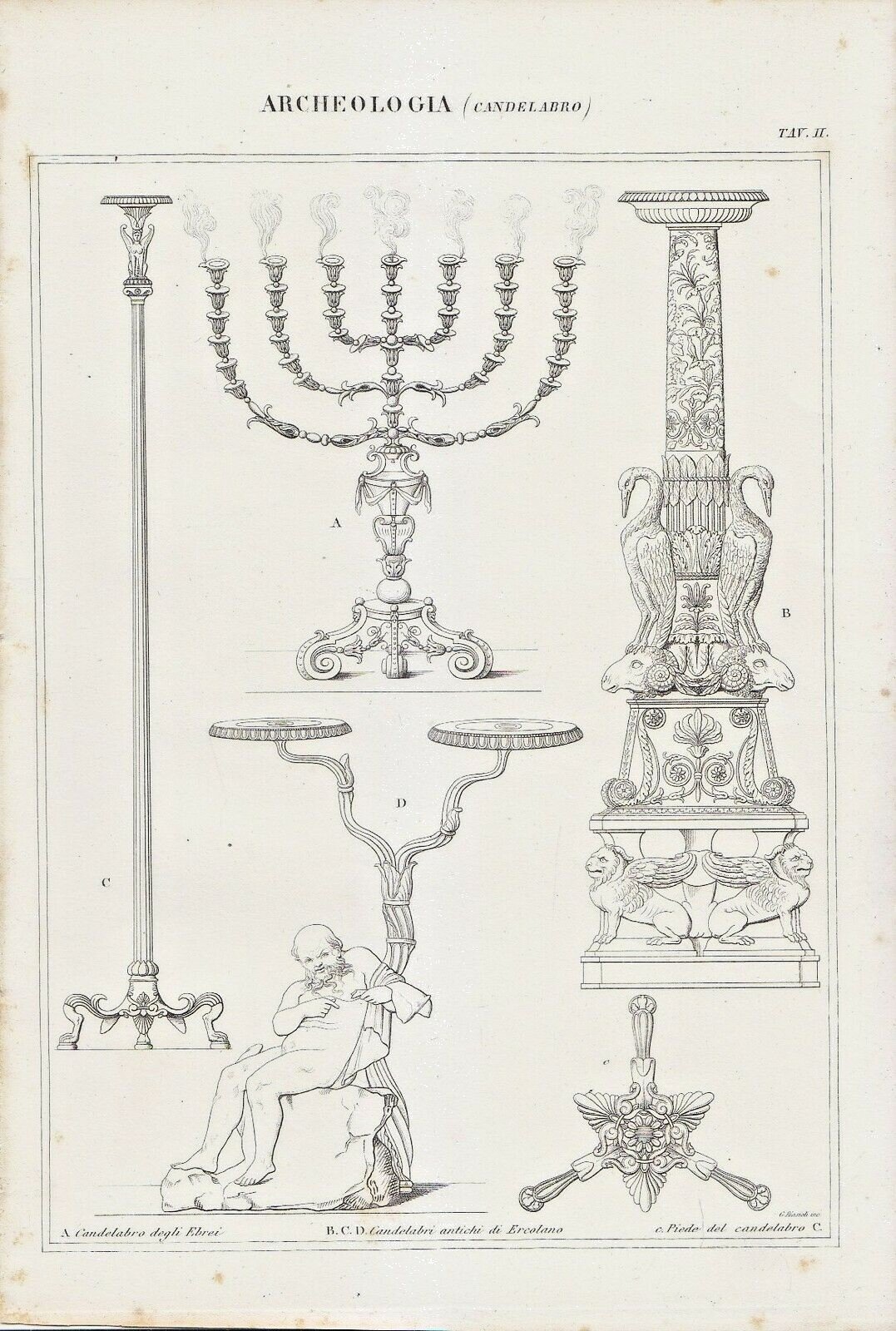 ARCHEOLOGIA CANDELABRO ERCOLANO EBREI Incisione Stampa Antica 1866 Originale