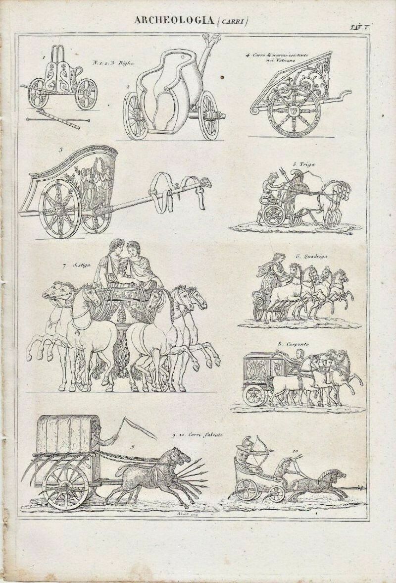 ARCHEOLOGIA CARRI BIGA CARPENTO FALCATI Incisione Stampa Antica 1866 Originale