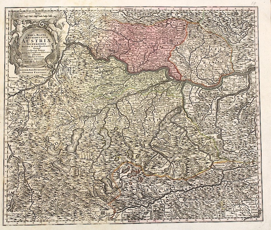 Incisione in rame, di mm 500x590, con coloritura originale d'epoca. Seutter, dopo un apprendistato presso Homann a Norimberga, trasferitosi ad Augsburg verso il 1720, aprì la propria attività superando il maestro sotto il profilo della bellezza: le sue carte hanno sempre colori brillanti e cartigli elaborati. Esemplare in ottimo stato di conservazione con qualche fioritura marginale. Due piccoli restauri al margine superiore.
