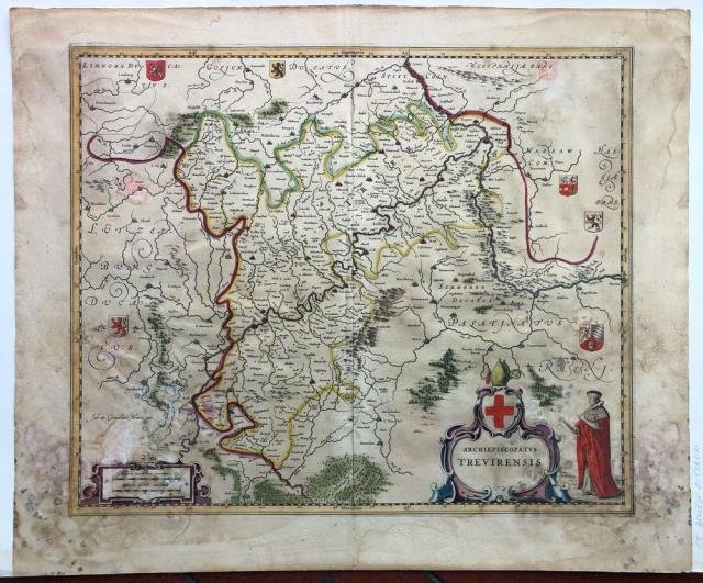 Amsterdam, 1640 circa. Dal “Theatrum Orbis Terrarum”, incisione in rame all'acquaforte, colore d'epoca, cm 42,3 x 50,3 (alla lastra), testo francese al verso. Treviri è una città della Germania sud-occidentale, situata nella regione vinicola della Mosella, vicino al confine con il Lussemburgo. Foglio interessato da aloni di umido e muffe nella parte inferiore del foglio, specie in corrispondenza degli angoli, mediocre stato di conservazione.
