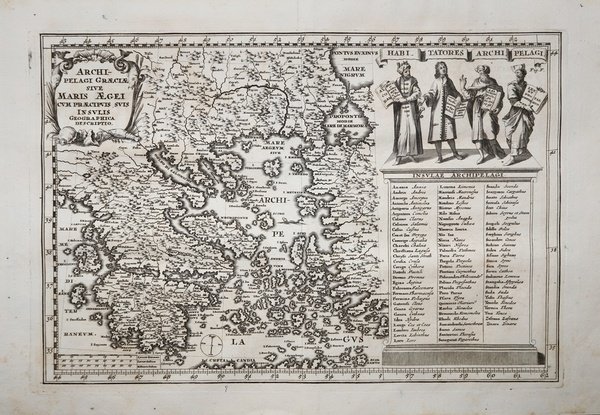 Bella e decorativa carta geografica della Grecia.Sul lato destro, su un basamento, sono raffigurate quattro figure maschili a rappresentare degli abitanti dell'arcipelago nel loro costume tipico. Sulla facciata del basamento, distribuito su tre colonne, l'elenco delle isole dell'arcipelago. Decorativa carta geografica pubblicata nell'opera di Heinrich Scherer ' Atlas Novus exhibens orbem terraguem per naturae opera, historiae navae acveterus monumenta, artistique geographicae leges et praecepta ' edita in 8 parti, stampate tra il 1702 e il 1710 a Monaco di Baviera. Heinrich Scherer, professore di matematica a Monaco di Baviera, era un gesuita devoto la cui opera sottolineava la gerarchia cattolica e la diffusione delle missioni gesuite in tutto il mondo. Il suo ' Atlas Novus ' contiene mappe di tutte le altre parti che mostravano la diffusione del cattolicesimo e delle missioni gesuite. Le 180 mappe incluse in questo lavoro sono state preparate tra il 1699 e il 1700 e sono state incise da Leonard Hecknaeur, Joseph Montelegre e Matthus Wolfgang; ogni volume è introdotto da splendidi frontespizi allegorici dagli stessi incisori. Incisione su rame, in ottimo stato di conservazione. Decorative map by Heinrich Scherer for his ' Atlas Novus exhibens orbem terraguem per naturae opera, historiae navae acveterus monumenta, artistique geographicae leges et praecepta.published in eight volumes from 1702-1710 in Munich. Scherer, a devout Jesuit, produced this geographical compendium to depict the Catholic hierarchy and the spread of Jesuit missions throughout the world. The 180 maps included in this work were prepared between 1699 and 1700 and were engraved by Leonard Hecknaeur, Joseph Montelegre or Matthus Wolfgang with each volume introduced by fine allegorical frontispieces by the same engravers. Copper engraving, in very good condition. Cfr.