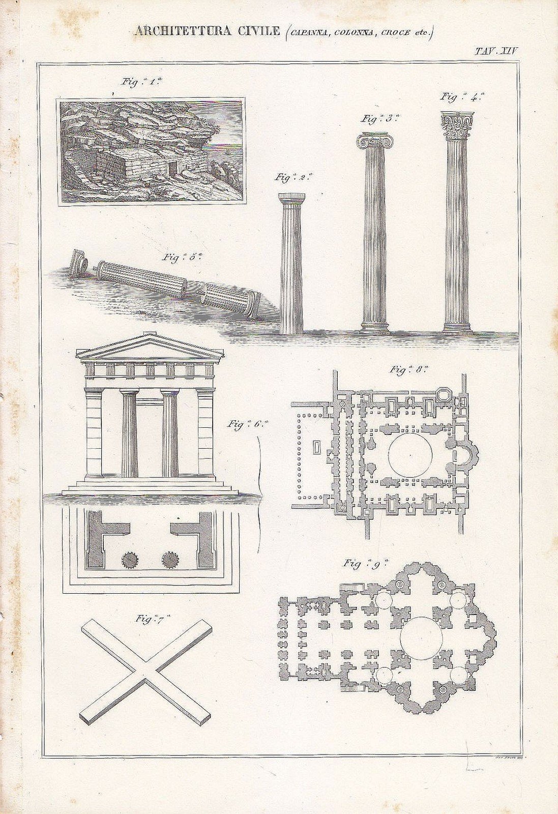 ARCHITETTURA CIVILE CAPANNA COLONNA CROCI Incisione Stampa Antica 1866 Originale