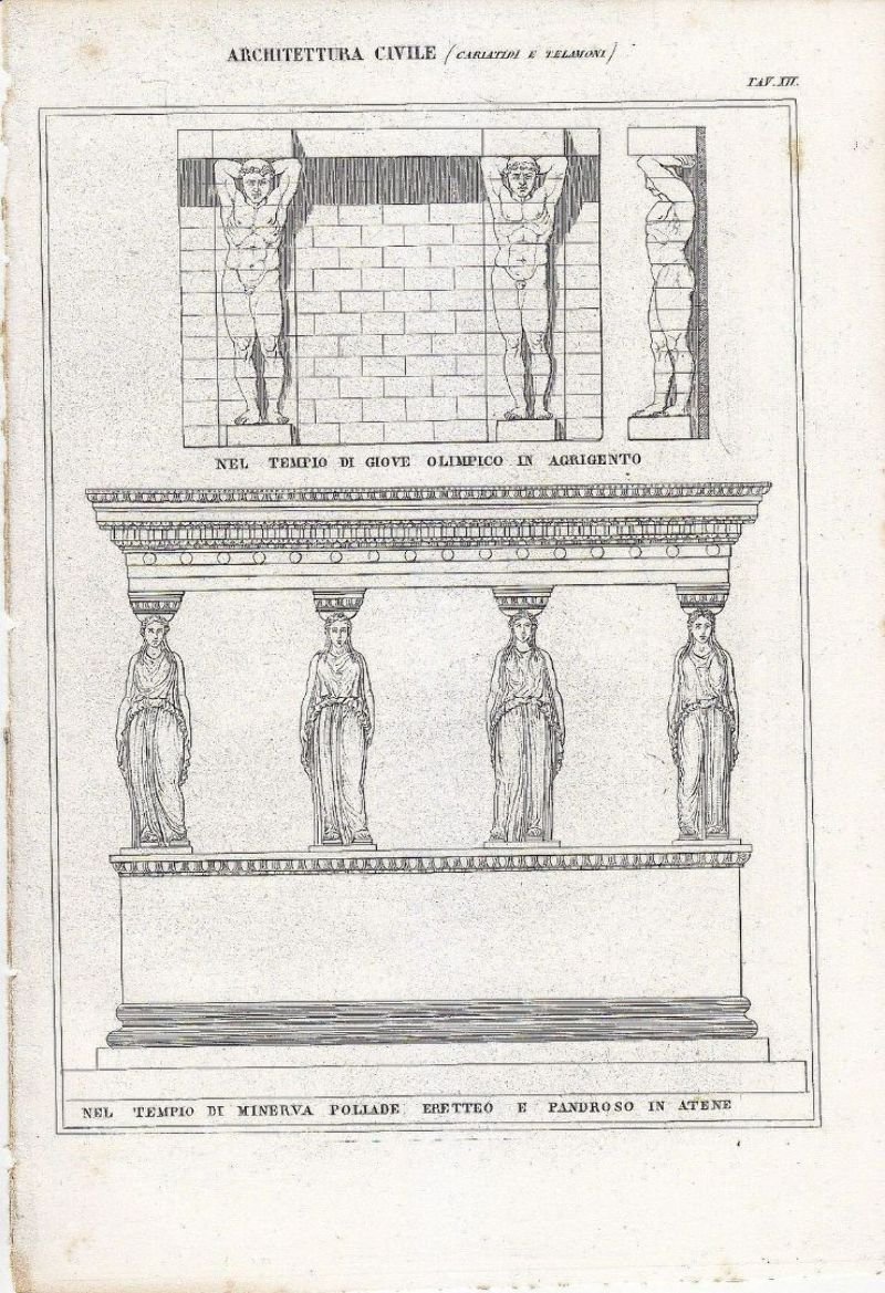 ARCHITETTURA CIVILE CARIATIDI TELAMONI Incisione Stampa Antica 1866 Originale