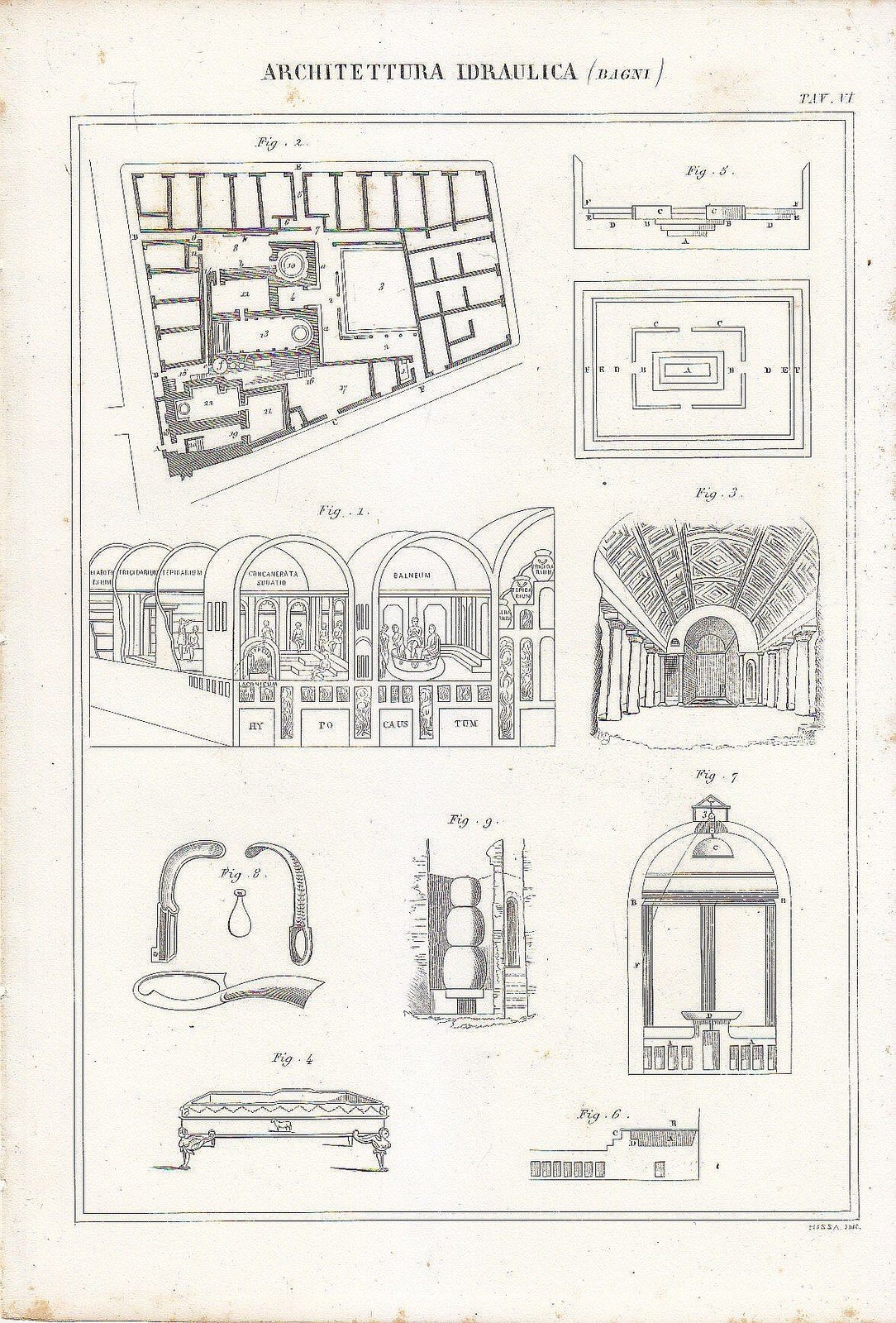 ARCHITETTURA IDRAULICA BAGNI Incisione Stampa Antica 1866 Tavola Originale