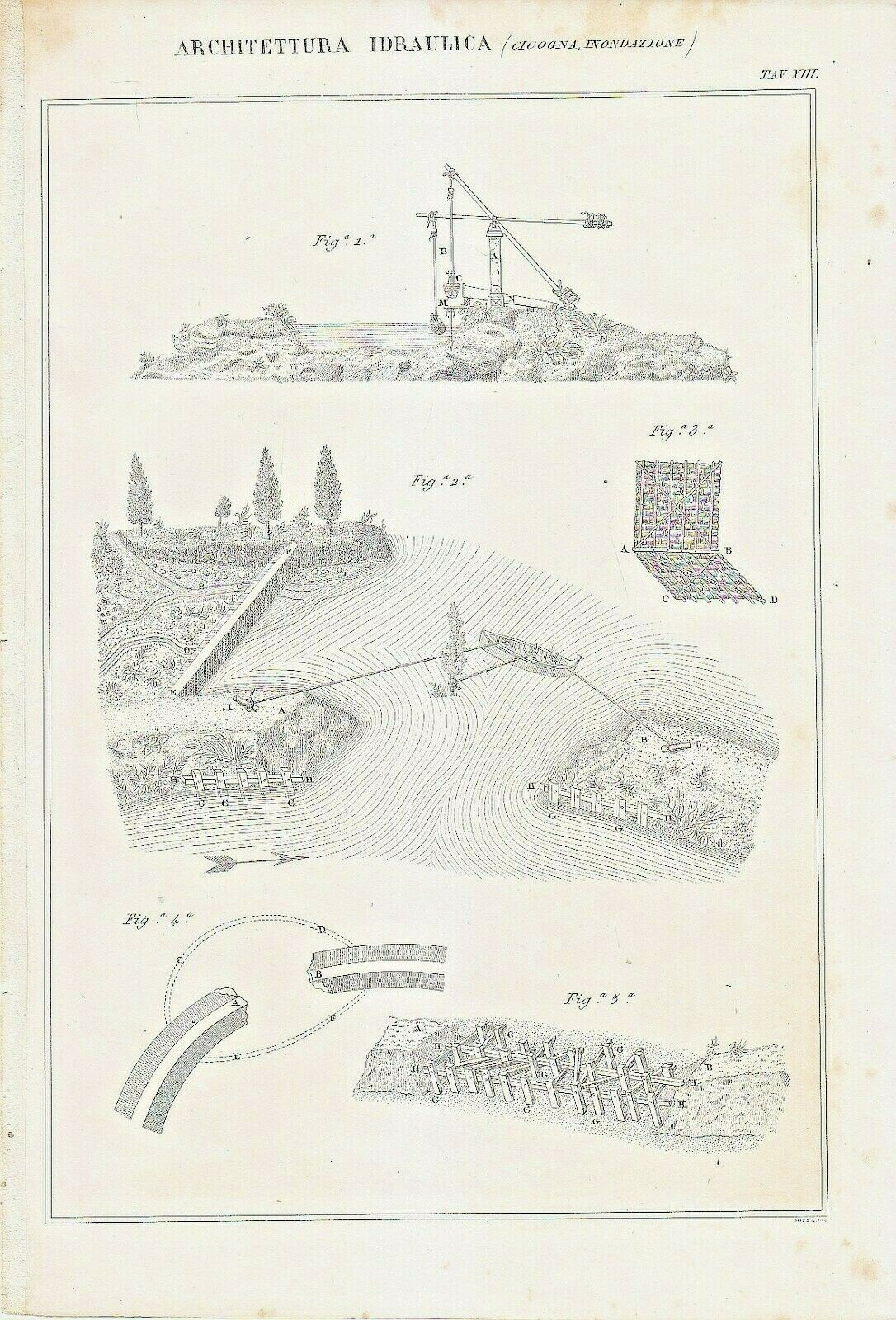 ARCHITETTURA IDRAULICA CICOGNA INONDAZIONE Incisione Stampa Antica 1866 Tavola