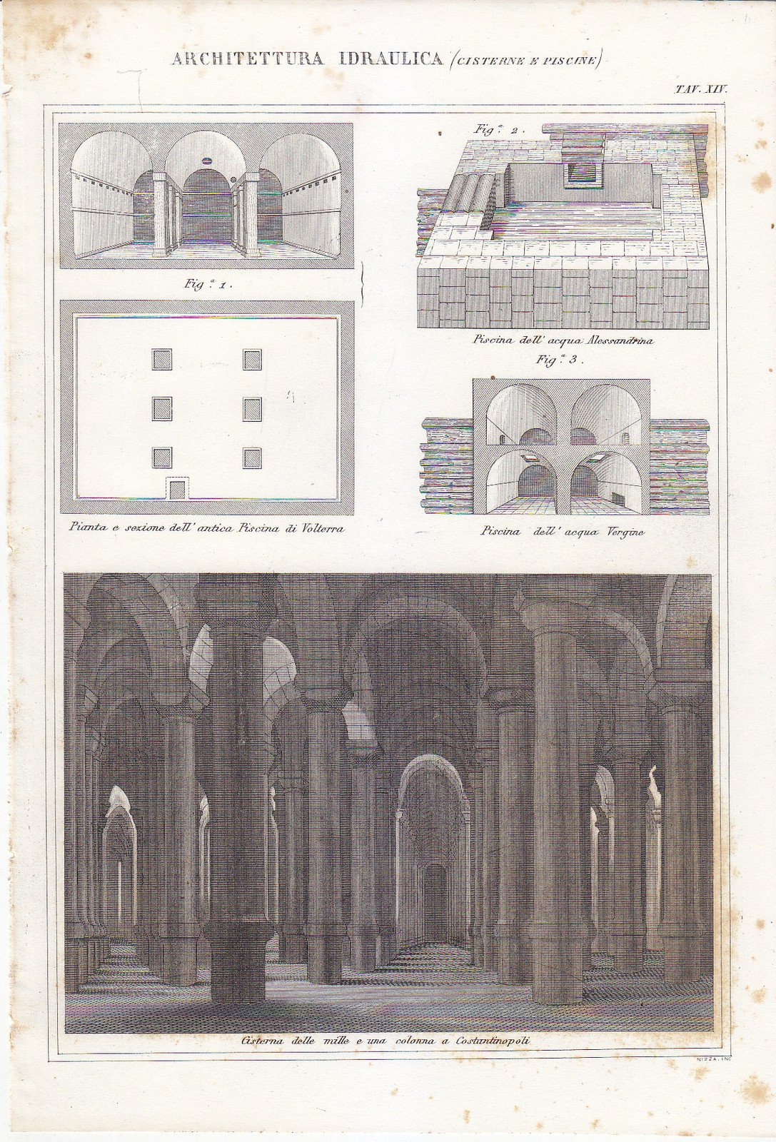 ARCHITETTURA IDRAULICA CISTERNE PISCINE Incisione Stampa Antica 1866 Tavola