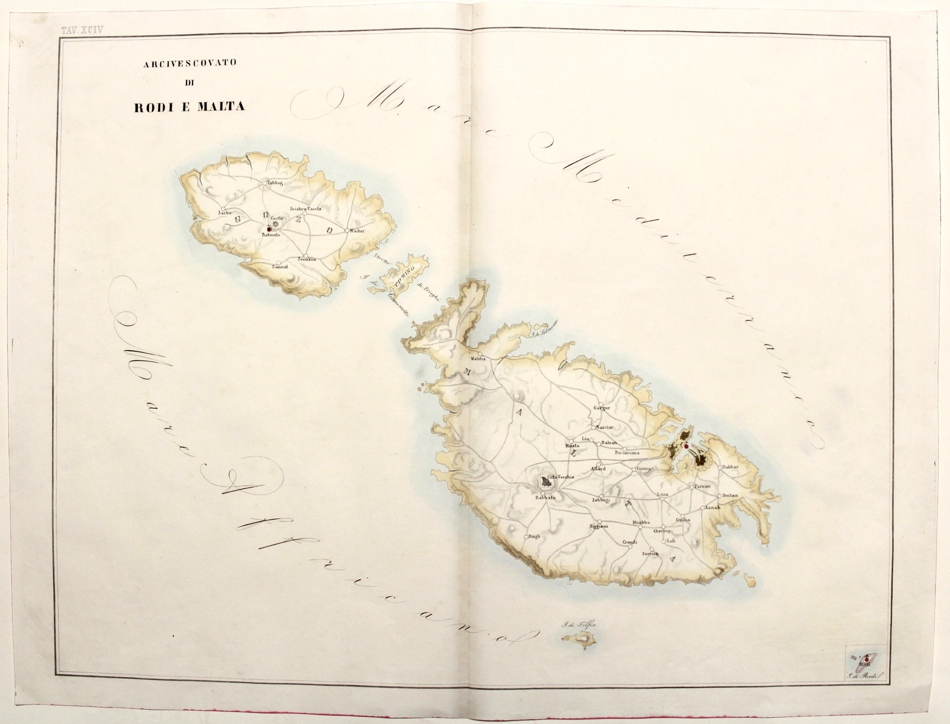 Incisione in rame al tratto, dipinta a mano d’epoca ad acquerello, mm 465x603. Rara carta geografica di Malta proveniente da "L'Orbe Cattolico ossia Atlante Geografico Storico Ecclesiastico Opera del Commendatore Girolamo Petri Officiale minutante della segreteria di Stato". In basso a destra piccolo riquadro con l’isola di Rodi. In perfette condizioni.