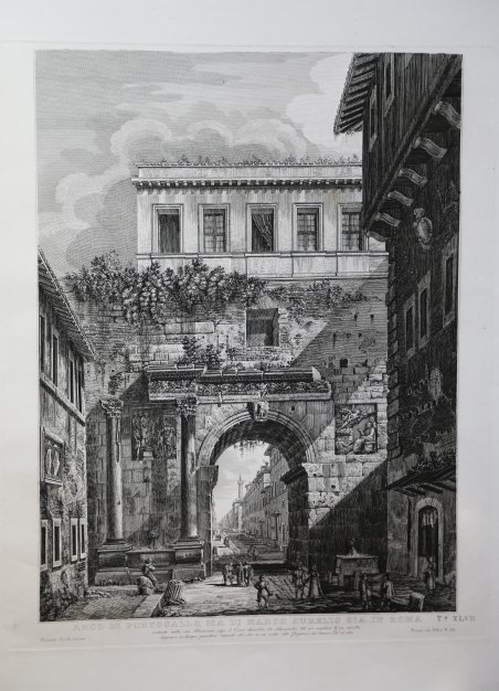 Veduta tratta da ' Gli Archi Trionfali Onorarii e Funebri degli Antichi Romani Sparsi per tutta Italia, ' rara opera del Rossini, pubblicata quale settima parte del grande corpus grafico dell’architetto ravennate sulle antichità romane, incentrata sugli archi trionfali e funerari eretti dagli imperatori romani. Un’opera, nella quale venissero ritratti in incisione i più celebrati Archi romani, mi parve potesse tornare di assai gradimento agli amatori delle antichità e delle arti belle, non meno che di utile sommo ai coltivatori di esse. Ne fin qui parmi che sia per anco venuto in pensiero ad alcuno un tale divisamento. ' Con tale affermazione Rossini presenta al pubblico nel 1836 la sua poderosa opera dedicata agli Archi trionfali, in 73 tavole, nella quale l'indagine non si limita al solo territorio di Roma e del Lazio, ma si allarga a tutta l'Italia. Nella struttura dell'opera, oltre alla ripresa dell'alternanza fra tavole di veduta e tavole di restauro, già adottata nei Sette Colli, sono inserite incisioni con dettagli decorativi e vedute parziali. Di ogni arco vengono presentate in genere le vedute interna ed esterna e la sua ipotetica ricostruzione; in alcuni casi come l'Arco di Tito, di Settimio Severo, di Costantino e di Traiano a Benevento; invece, il monumento è sottoposto ad una minuziosa analisi descrittiva. Gli ' Archi trionfali ' sono eccezionalmente dedicati dall'autore al Marchese Luigi Biondi, Presidente della Pontificia Accademia Romana di Archeologia; nel testo della dedica, l'unica pubblicata da Rossini, sembra che questi voglia allontanare il sospetto di un interesse personale affermando di rendere omaggio alla chiara fama dell'illustre destinatario. Dal manoscritto della ' Prefazione ' con il commento alle tavole (Forlì, Bibl. Civ.) si apprende che l'incisore aveva iniziato il lavoro nel 1832 e che il testo era stato sottoposto alla revisione dell'erudito Salvatore Betti. I consensi ottenuti dall’opera presso il mondo culturale romano confermano il ruolo di primo piano svolto ormai da Rossini nel campo dell'incisione. La vivacità di interessi storici ed antiquari presente fin dalle sue prime opere, si è andata definendo secondo un crescente rigore scientifico che gli procura, nel 1835, la nomina a socio dell'Instituto di Corrispondenza Archeologica, fondato a Roma nel 1829. Incisione in rame, in ottimo stato di conservazione. Bibliografia L. Cavazzi in ' Luigi Rossini incisore, Vedute di Roma 1817-1850, ' pp. 146-151. The triumphal arch of Portogallo, taken from Gli Archi Trionfali Onorarii e Funebri degli Antichi Romani Sparsi per tutta Italia by Luigi Rossini. ' Copperplate, wide margins, in very good condition. Cfr. Luigi Rossini Incisore, 121