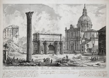 Acquaforte e bulino, 1759 circa, firmata in lastra in basso. Tiratura “romana” della lastra, esemplare nel quarto stato di sei descritto da Hind, con l’indirizzo “Presso l’Autore a Strada Felice nel palazzo Tomati vicino alla Trinità de’ monti”. Bellissima prova, impressa su carta vergata coeva con filigrana “giglio con corona” (Robison 58), con margini, in perfetto stato di conservazione. Antiche iscrizioni ad inchiostro bruno - probabilmente coeve - che traducono in lingua francese il titolo e le didascalie dell'incisione. Della serie ' Vedute di Roma. L’opera consiste in 135 lastre prodotte individualmente dal Piranesi per almeno 30 anni, da circa il 1745, fino alla data della sua morte. All’opera sono aggiunte poi due vedute realizzate dal figlio Francesco. Per la prima volta furono edite dall’editore Giovanni Bouchard nel 1751 (34 lastre), successivamente dallo stesso Piranesi editore a ' Strada Felice ' prima e ' Palazzo Tomati ' poi (indirizzi che appaiono su molte tavole), fino alla stesura definitiva composta da 137 lastre. Successivamente alla morte dell’autore le matrici furono ereditate dal figlio Francesco, che ne curò la pubblicazione prima nella capitale - le cosiddette tirature “postume romane” - e successivamente a Parigi, dove furono stampate tre edizioni – la cosiddetta “prima di Parigi”, una intermedia (entrambe su carta vergata) e quella curata dall’editore Firmin Didot, la prima su carta senza vergelle, dove le tavole presentano l’aggiunta di un numero arabo ordinale. Tutte le tirature parigine sono piuttosto modeste in qualità, lontane da come il Piranesi le aveva pensate e concepite. Le lastre furono poi acquisite dalla Calcografia Camerale, poi Calcografia Nazionale, oggi Istituto Centrale per la Grafica, dove sono tuttora conservate. Bibliografia Arthur M. Hind, ' Giovanni Battista Piranesi, A critical study ' (1922), n. 54, IV/VI; H. Focillon, ' Giovanni Battista Piranesi ' (1918), n. 809. ' Etching and engraving, 1759 circa, signed on plate. Example of the fourth state of six described by Hind, with the address “Presso l’Autore a Strada Felice nel palazzo Tomati vicino alla Trinità de’ monti”, from the Roman Edition. Beautiful proof, printed on contemporary laid paper with "lily with crown" watermark (Robison 58), with margins, in perfect condition. Antique brown ink inscriptions - probably of the time - that translate the title and captions of the engraving into French. View taken from Piranesi’s ' Vedute di Roma. The whole work consists of 135 plates which have been individually produced by Piranesi along 30 years, from 1745 circa until his death. Two more works have been subsequently added, two plates by his son Francesco. They have been printed for the first time in 1751 (34 plates) by the editor Giovanni Bouchard, afterwards by Piranesi himself, publisher first in ' Strada Felice ' an the in ' Palazzo Tomati, imprint that can be found in mostly of the plates), until the final edition of 137 plates. After Piranesi's death, his son Francesco inherited the plates, editing them first in Rome and then in Paris, where three editions were printed - the so-called "first Paris edition", an intermediate one (both on laid paper) and the one edited by the publisher Firmin Didot, the first on wove paper, where the plates have an Arabic ordinal number added. All Parisi issues are rather modest in quality, far from how Piranesi had thought and conceived them. The plates were then acquired by the Calcografia Camerale, then Calcografia Nazionale, today Istituto Centrale per la Grafica, where they are still kept. Bibliografia Arthur M. Hind, ' Giovanni Battista Piranesi, A critical study ' (1922), n. 54, IV/VI; H. Focillon, ' Giovanni Battista Piranesi ' (1918), n. 809. ' Cfr.