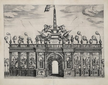 Arco monumentale, sormontato da obelisco, decorato con figure emblematiche. Acquaforte e bulino, 1599 circa, priva di firma, impressa su carta vergata coeva, con margini, testo descrittivo al verso, in ottimo stato di conservazione. Raffigura un arco trionfale eretto in onore di Alberto d’Austria e Isabella di Spagna. L’opera è una delle illustrazioni di uno dei più bei libri di feste fiamminghi, la ' Historica narratio profectionis et inagurationis serenissimorum belgii principum Alberti et Isabellae, Austriae Archiducum. Et eorum optatissimi in Belgium Adventus ' di Johannes Bochius, stampato con imprint Ex ' Officina Plantiniana apud Joannem Moretum, Antuerpia, 1602. Il libro descrive e illustra i festeggiamenti che si svolsero nelle città di Bruxelles, Anversa, Gand e Valencia in onore dell'arrivo nel 1599 degli arciduchi d'Austria, il principe Alberto e sua moglie, la principessa Isabella di Spagna, figlia di Filippo II, come reggenti dei Paesi Bassi. Le straordinarie tavole sono state eseguite integralmente da Pieter van der Borcht (1545-1608), allievo di Pieter Breughel, considerato uno dei grandi incisori del suo tempo. Le dettagliate illustrazioni della presente opera raffigurano gli archi di trionfo, le processioni, i fuochi d'artificio, i teatri e altre decorazioni effimere che venivano erette nelle rispettive città al passaggio del seguito. Particolarmente degno di nota è il dettaglio con cui vengono illustrati gli usi e i costumi degli abitanti e i dettagli architettonici delle case e degli altri edifici, delle strade e delle piazze pubbliche, soprattutto ad Anversa. Secondo Delén (1934, p. 97) le stampe di Van der Borcht rappresentano il passaggio intermedio tra le illustrazioni di stile manierista realizzate da Pieter Coecke per l'ingresso di Filippo II e quelle pienamente barocche di Rubens per il Cardenal Infante. Bibliografia Sconosciuta ad Hollstein; J. J. Delén, ' Le XVIe siècle. ' Les graveurs-illustrateurs. ' Paris: Les Èditions d'Art et d'Histoire, 1934, p. 97; Margit Thøfner, ' Marrying the City, Mothering the Country: Gender and Visual Conventions in Johannes Bochius's Account of the Joyous Entry of the Archduke Albert and the Infanta Isabella into Antwerp, in “Oxford Art Journal”, Vol. 22, No. 1 (1999), pp. 1-27; Praz, 23. Hiler, 95. Lipperheide, 2657. Graesse I, 458. Monumental arch, surmounted by obelisk, decorated with emblematic figures. ' Etching and engraving, 1599 circa, lettered with title and motto within image; verso lettered with text pp.231, 234. A fine impression, printed on contemporary laid paper, with margins, very good condition. ' It depicts a triumphal arch erected in honor of Albert of Austria and Isabella of Spain. The work is one of the illustrations in one of the finest Flemish festival books, the Historica narratio profectionis et inagurationis serenissimorum belgii principum Alberti et Isabellae, Austriae Archiducum. Et eorum optatissimi in Belgium Adventus by Johannes Bochius, printed with imprint Ex Officina Plantiniana apud Joannem Moretum, Antuerpia, 1602. ' The book describes and illustrates the festivities that took place in the cities of Brussels, Antwerp, Ghent and Valencia in honor of the arrival in 1599 of the archdukes of Austria, Prince Albert and his wife, Princess Isabella of Spain, daughter of Philip II, as regents of the Netherlands. ' The extraordinary plates were executed in their entirety by Pieter van der Borcht (1545-1608), a pupil of Pieter Breughel, considered one of the great engravers of his time. The detailed illustrations in this work depict the triumphal arches, processions, fireworks, theaters and other ephemeral decorations that were erected in the respective cities as the retinue passed through. Particularly noteworthy is the detail with which the customs and habits of the inhabitants are illustrated and the architectural details of houses and other buildings, streets and public squares, especially in Antwerp. ' According to Delén (1934, p. 97), Van der Borcht's prints represent the intermediate step between the Mannerist-style illustrations made by Pieter Coecke for the entry of Philip II and the fully Baroque ones by Rubens for the Cardenal Infante. ' Bibliografia Not in Hollstein; J. J. Delén, Le XVIe siècle. Les graveurs-illustrateurs. Paris: Les Èditions d'Art et d'Histoire, 1934, p. 97; Margit Thøfner, Marrying the City, Mothering the Country: Gender and Visual Conventions in Johannes Bochius's Account of the Joyous Entry of the Archduke Albert and the Infanta Isabella into Antwerp, in “Oxford Art Journal”, Vol. 22, No. 1 (1999), pp. 1-27; Praz, 23. Hiler, 95. Lipperheide, 2657. Graesse I, 458. Cfr.
