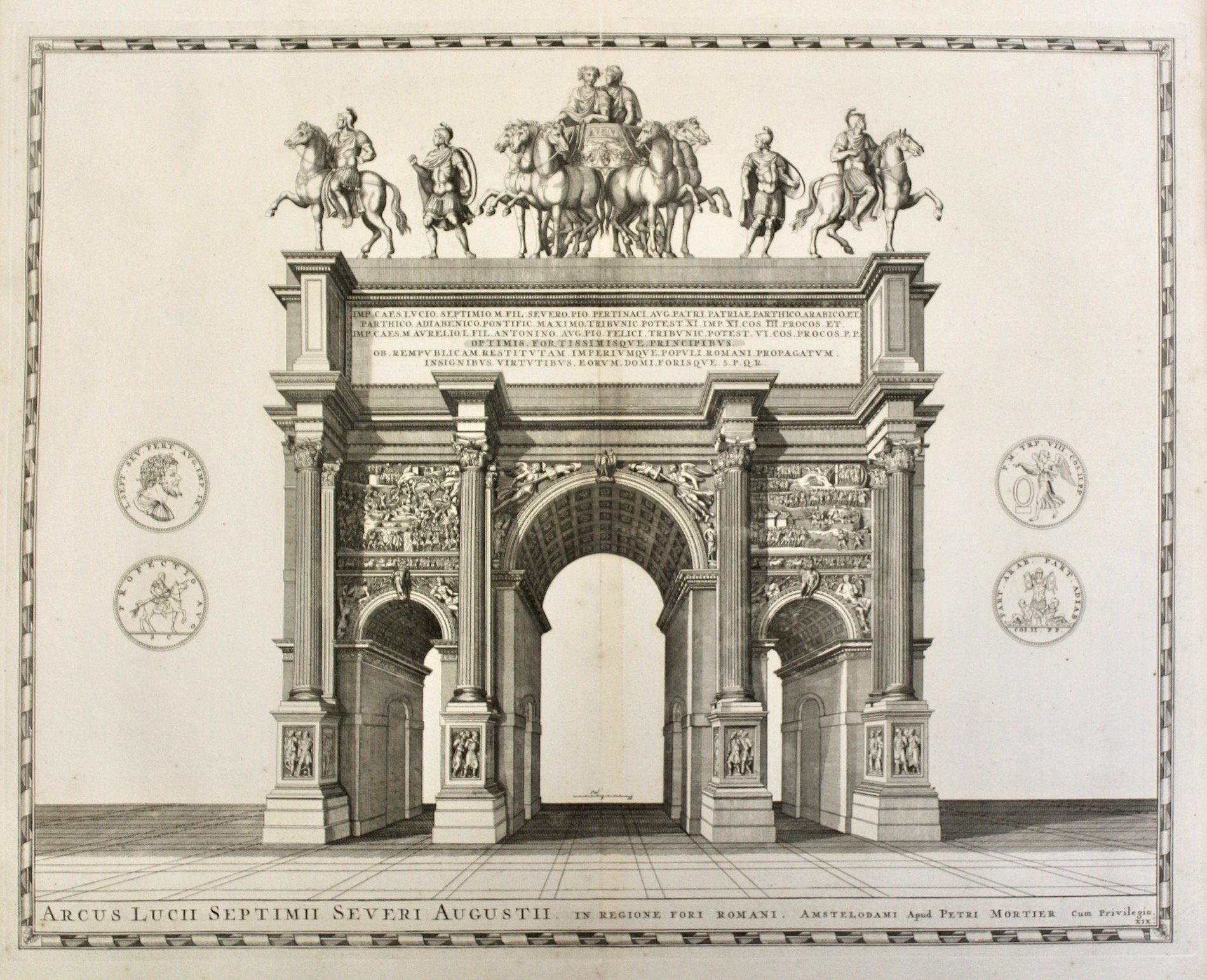 Incisione in rame di mm 465x595. Bella veduta dell'arco di Settimio Severo presso i Fori Imperiali. Pierre Mortier (1661-1711) fu un editore assai attivo ad Amsterdam agli inizi del XVIII secolo: tra le sue principali fatiche si annovera la ristampa del "Theatrum Civitatum…Italiae" di Blaeu con l'aggiunta originale di un quarto volume, relativo a nord Italia e Toscana. La tavola proviene proprio da quest'opera. Ottimo esemplare. <BR>