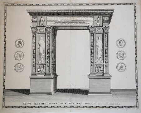 Bella veduta dell'arco di Settimio Severo. Opera per la prima volta pubblicata nel Theatrum Civitatum et admirandorum Italiae, pubblicato ad Amsterdam nel 1663. Johannes Blaeu, durante la sua lunga attività editoriale pubblica tre volumi sulle città italiane. ' Nel 1663 i primi tre comprendevano: Stato della Chiesa, Roma e Regno di Napoli, Sicilia. ' Alla sua morte, i suoi eredi danno alla luce altri due volumi, datati 1682, incentrati sulle città del Piemonte e della Savoia, poi ristampati da altri editori nel 1693 e 1697. Il francese Pierre Mortier pubblica una ristampa nel 1704/5, intitolata Nouveau Theatre de l’Italie. ' L’opera, in quattro volumi, comprende le lastre del Blaeu, ritoccate e modificate in piccola parte, integrate dall’aggiunta di numerose nuove mappe di proprio disegno, raffiguranti le città della parte settentrionale della penisola, racchiuse nel primo volume dell’opera. ' L’atlante del Mortier venne pubblicato con testo latino, francese ed olandese. La particolarità che differenzia le due edizioni di Blaeu e Mortier è rappresentata dal fatto che il testo non è al verso della singola mappa (che quindi è bianca nel retro), ma si trova all’inizio di ogni singolo volume. ' Il grande successo dell’opera diede origine ad un’ulteriore ristampa, praticamente identica, curata da R. Alberts ed edita nel 1724/5. Le opere tratte dalla prima edizione del Blaeu, 1663, sono caratterizzate dalla presenza del testo al verso e sono piuttosto rare. ' Incisione in rame, in buono stato di conservazione. ' Esemplare tratto dal Nouveau Theatre de l'Italie pubblicato ad Amsterdam nel 1704/5 o nel 1724. Bella veduta dell'arco di Settimio Severo. Opera per la prima volta pubblicata nel Theatrum Civitatum et admirandorum Italiae, pubblicato ad Amsterdam nel 1663. Johannes Blaeu, durante la sua lunga attività editoriale pubblica tre volumi sulle città italiane. ' Nel 1663 i primi tre comprendevano: Stato della Chiesa, Roma e Regno di Napoli, Sicilia. ' Alla sua morte, i suoi eredi danno alla luce altri due volumi, datati 1682, incentrati sulle città del Piemonte e della Savoia, poi ristampati da altri editori nel 1693 e 1697. Il francese Pierre Mortier pubblica una ristampa nel 1704/5, intitolata Nouveau Theatre de l’Italie. ' L’opera, in quattro volumi, comprende le lastre del Blaeu, ritoccate e modificate in piccola parte, integrate dall’aggiunta di numerose nuove mappe di proprio disegno, raffiguranti le città della parte settentrionale della penisola, racchiuse nel primo volume dell’opera. ' L’atlante del Mortier venne pubblicato con testo latino, francese ed olandese. La particolarità che differenzia le due edizioni di Blaeu e Mortier è rappresentata dal fatto che il testo non è al verso della singola mappa (che quindi è bianca nel retro), ma si trova all’inizio di ogni singolo volume. ' Il grande successo dell’opera diede origine ad un’ulteriore ristampa, praticamente identica, curata da R. Alberts ed edita nel 1724/5. Le opere tratte dalla prima edizione del Blaeu, 1663, sono caratterizzate dalla presenza del testo al verso e sono piuttosto rare. ' Incisione in rame, in buono stato di conservazione. ' Esemplare tratto dal Nouveau Theatre de l'Italie pubblicato ad Amsterdam nel 1704/5 o nel 1724. Cfr. Koeman pp. 332/338, Cremonini pp. 83-90.