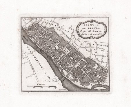 Pianta del rione tratta dalla celebre guida di Roma di Dominique Magnan La ville de Rome, ou, Description abre?ge?e de cette superbe ville: divise?e en quatre volumes: et orne?e de 425 planches en taille douce. A Rome: De l'imprimerie d'Archange Casaletti . : Chez Venan. Monaldini, Bouchard et Gravier : Gregoire Settari ., 1778. Dominique Magnan (1731–1796), dotto abate francese del convento della Trinità dei Monti, dell'ordine dei minimi, a Roma, che fu profondamente coinvolto nella vita intellettuale della sua comunità durante la seconda metà del XVIII secolo. Ha studiato all'università di Avignone, poi si è unito ai Minimi di La Ciotat all'età di 20 anni, dove ha iniziato la sua carriera come collezionista di monete e medaglie antiche. Nominato professore di teologia a Marsiglia, ha continuato il suo lavoro. Si mise in contatto con i più famosi antiquari dell'epoca, sia in Italia che in Germania, e acquisì rapidamente una vasta reputazione. I suoi primi libri hanno ricevuto il plauso della critica. Ma i suoi lavori più significativi erano sulla numismatica sebbene fortemente criticati dagli specialisti dell'epoca in quanto la copertura universale e completa del soggetto poteva mantenere la confusione tra monete autentiche e false. ' Bibliografia: Rossetti, G-1285; ' Schudt ' 363. Map taken from the famous guide of Rome by Dominique Magnan La ville de Rome, ou, Description abre?ge?e de cette superbe ville: divise?e en quatre volumes: et orne?e de 425 planches en taille douce. A Rome: De l'imprimerie d'Archange Casaletti . : Chez Venan. Monaldini, Bouchard et Gravier : Gregoire Settari ., 1778. Dominique Magnan (1731–1796), a learned French abbot of the Trinità dei Monti convent, of the order of the minims, in Rome, who was deeply involved in the intellectual life of his community during the second half of the 18th century. ' He studied at the University of Avignon, then joined the Minims of La Ciotat at age 20, where he began his career as a collector of ancient coins and medals. Appointed professor of theology in Marseille, he continued his work. He got in touch with the most famous antiquaries of the time, both in Italy and Germany, and speedily acquired an extensive reputation. His first books received critical acclaim. But his most significant works were on numismatics though heavily criticized by specialists of the time in that universal and complete coverage of the subject could maintain confusion between authentic coins and the fake ones. ' Bibliografia: Rossetti, G-1285; ' Schudt ' 363. Cfr.