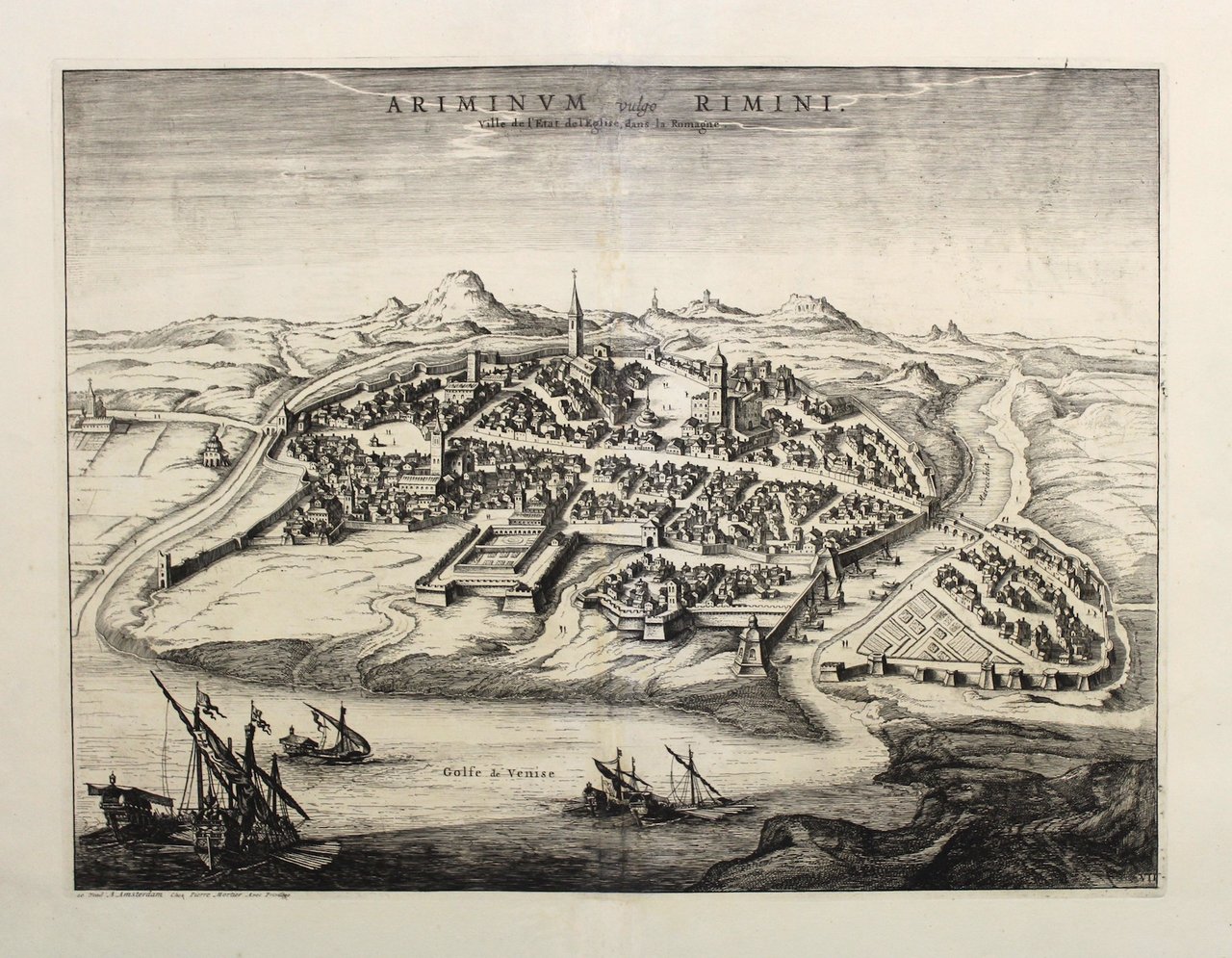 Incisione in rame, 420x600. Pianta prospettica di Rimini. Mortier, editore attivo ad Amsterdam ad inizio secolo, ristampò il "Theatrum Civitatum…Italiae" di Blaeu del 1663 aggiungendovi un quarto volume, relativo a nord Italia e Toscana. Bell' esemplare con lieve restauro lungo la piega editoriale e minima parte dell'incisione reintegrata.