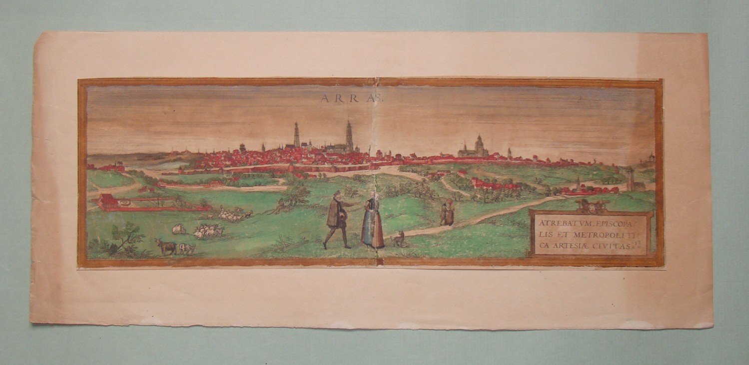 1600 ca. etching. Cm.16x47. Cont. hand coloured. Cartouche: Atrebatum Episcopalis et Metropolitica Artesiae Civitas.