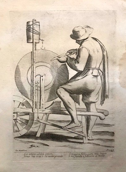 Incisione originale su rame ad opera di Francesco Curti (cm. 19,5x27,5 più ampi margini bianchi) impressa su carta con filigrana. Tratta dalla rara opera ‘L’Arti per via.’. Lievi aloni marginali, peraltro esemplare in ottimo stato di conservazione. Non comune.