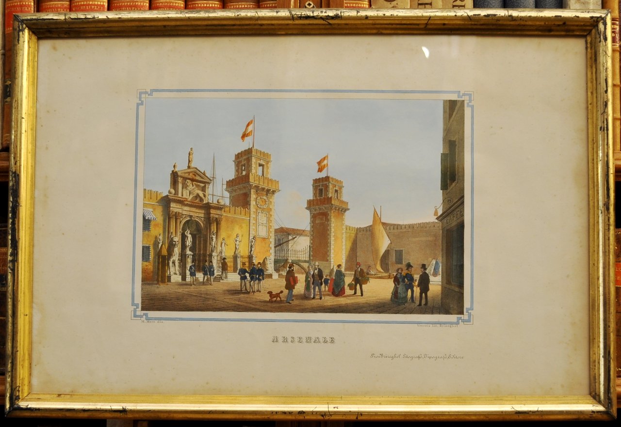 Litografia, 320 x 480 mm. Acquarellatura d'epoca. Litografia con cornice originale ottocentesca e vetro antico. In basso a sinistra in piccolo "M. Moro dis.", a destra "Venezia Lit. Brizeghel". Sotto in grande "Arsenale". Ancora più in basso, in piccolo "Gio. Brizeghel Litografo,Tipografo, Editore". Foglio pubblicato anche nell'album "Venezia prospettica, monumentale, storica, artistica. con sessanta tavole litografiche disegnate da Marco Moro e da Giuseppe Rebellato. Venezia, Giovanni Brizeghel editore, Tip. Lit. Calc. e Libraio, Procuratie Vecchie. Original litographs in a perfect romantic handmade coloration. The golden frame in mika is contemporary with the print.The lito was part of the big album published by "Gio. Brizeghel Litografo Tipografo editore". Fa parte di: Venezia prospettica, monumentale, storica, artistica. con sessanta tavole litografiche disegnate da Marco Moro e da Giuseppe Rebellato. Venezia, Giovanni Brizeghel editore, Tip. Lit. Calc. e Libraio, Procuratie Vecchie N. 137.