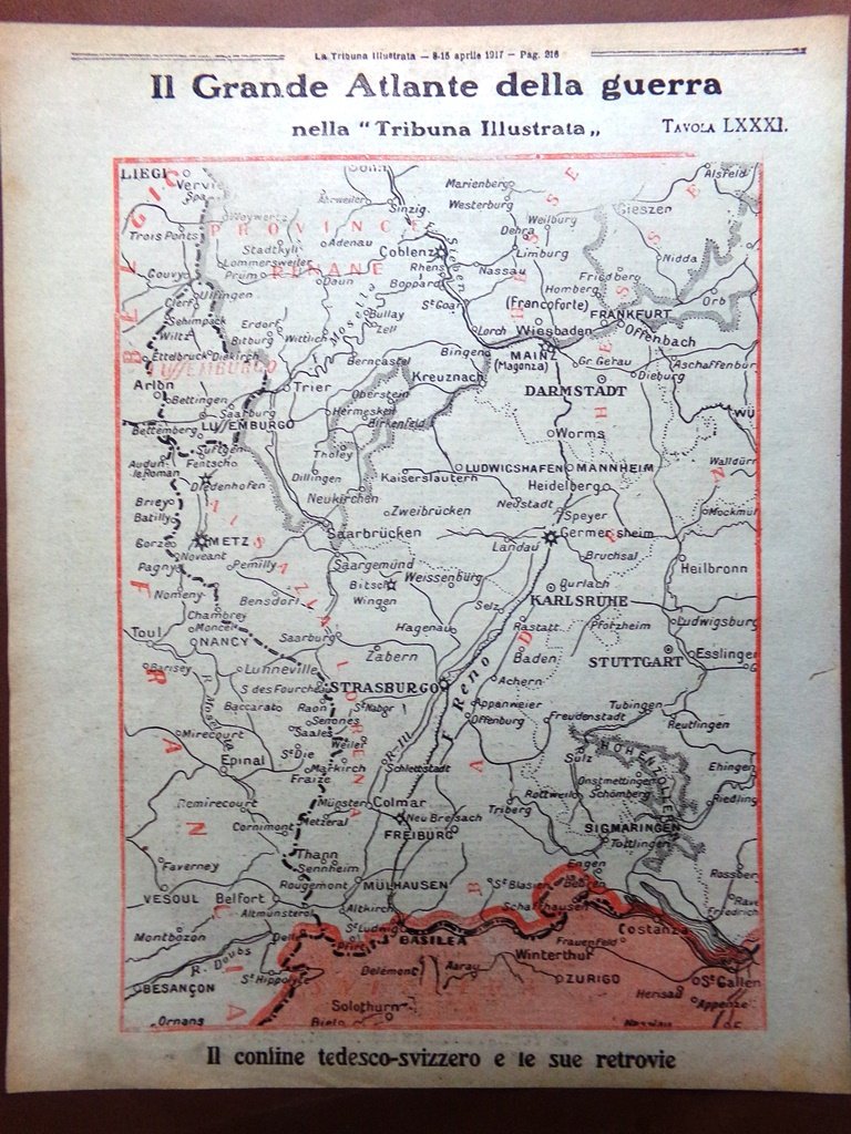 Articolo del 1917 WW1 Grande Atlante Guera Confine Germania Svizzera Retrovie