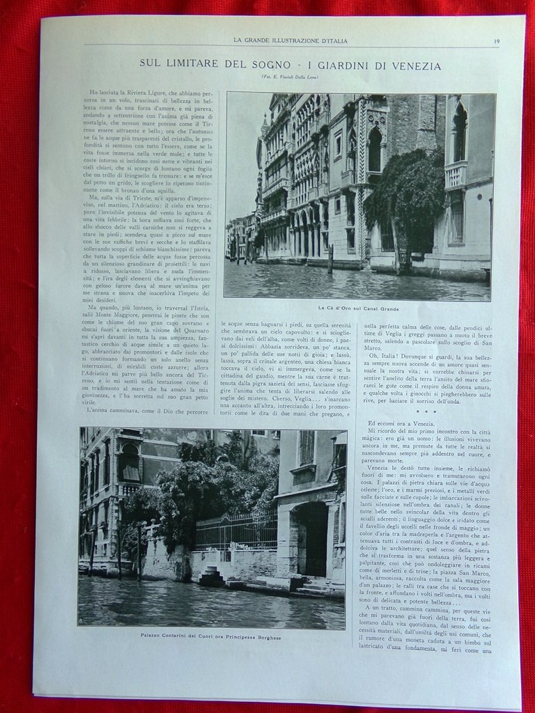 Articolo del 1925 I Giardini di Venezia Vidal Venier Vendramin Contarini Canali